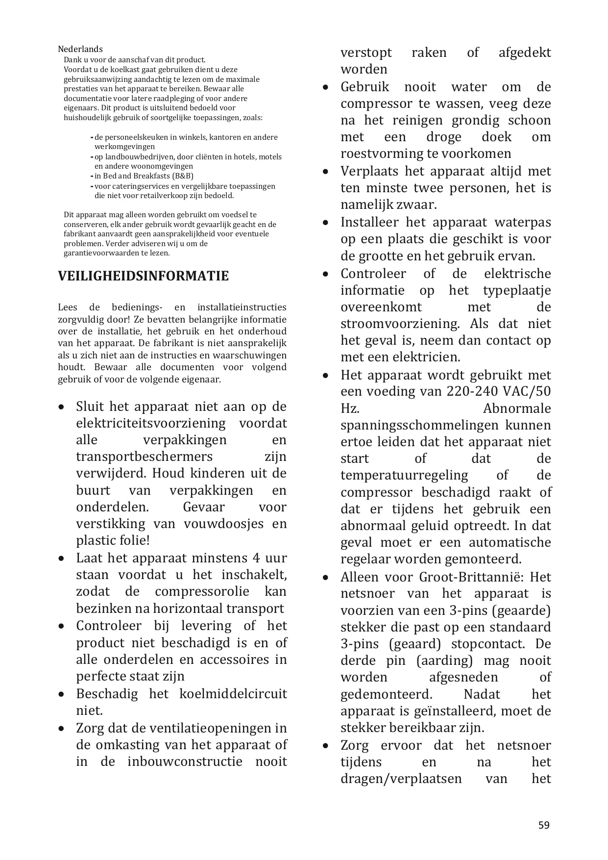Cet appareil doit être utilisé uniquement pour conserver de la nourriture ; tout autre usage est considéré comme dangereux et le fabricant ne sera pas tenu responsable en cas de mauvaise utilisation. Il est donc recommandé de prendre connaissance des conditions de garantie.