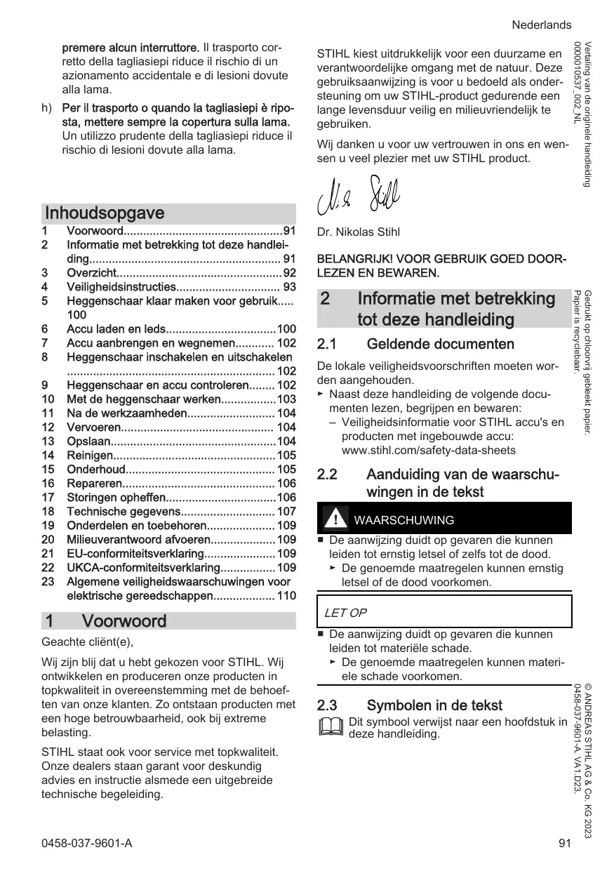 veau: 92 dB(A) De technische documentatie wordt bij de pro- ductgoedkeuring van ANDREAS STIHL AG & Co. KG bewaard. Het productiejaar, het productieland en het machinenummer staan vermeld op de heggens- chaar. Waiblingen, 09.03.2023