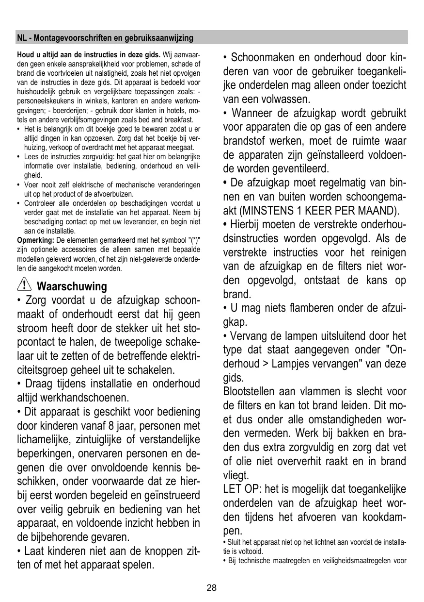 + La hotte doit être régulièrement netto- yée à la fois à l'intérieur et à l'extérieur (AU MOINS UNE FOIS PAR MOIS); cela devrait se faire en conformité avec les instructions d'entretien. Le non respect des instructions expressément fournies concernant le nettoyage de la hotte et des filtres peut provoquer des risques d'incendie.