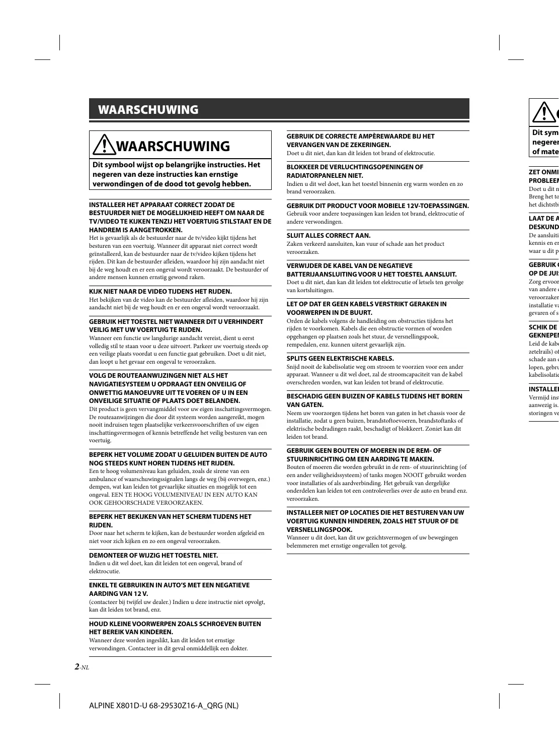 1-NL ALPINE X801D-U 68-29530Z16-A_QRG (NL) WAARSCHUWING WAARSCHUWING Dit symbool wijst op belangrijke instructies. Het negeren van deze instructies kan ernstige verwondingen of de dood tot gevolg hebben.