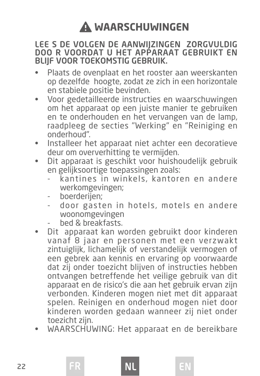 MISE EN GARDE: Cet appareil et ses parties accessibles deviennent chauds pendant leur utilisation. Il convient de veiller à ne pas toucher les éléments chauffants. Il convient de maintenir à distance les enfants de moins de 8 ans, à moins qu'ils ne soient sous une surveillance continue.
