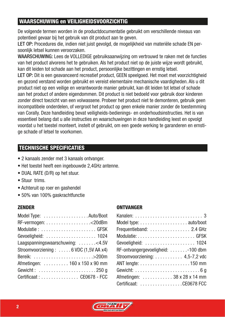 ATTENTION : Il s’agit d’un produit de loisir sophistiqué et NON d'un jouet. Il doit être utilisé avec prudence et bon sens et nécessite des compétences mécaniques de base. Le fait de ne pas utiliser ce produit de manière sûre et responsable peut entraîner des blessures ou des dommages au produit ou à d'autres biens. Ce produit n'est pas destiné à être utilisé par des enfants sans la surveillance directe d’un adulte. N'essayez pas de démonter, d'utiliser des composants incompa- tibles ou d'augmenter le produit de quelque façon que ce soit sans l'approbation de Corally. Ce manuel contient des instructions relatives à la sécurité, au fonctionnement et à l'entretien. Il est essentiel de lire et de suivre toutes les instructions et tous les avertissements contenus dans le manuel, avant l'assemblage, la configuration ou l’utilisation, afin de fonctionner correctement et d'éviter tout dommage ou blessure grave.