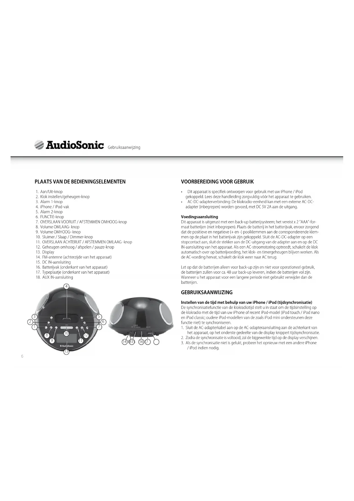 - AC-DC-adapterverbinding: De klokradio-eenheid kan met een externe AC-DC- adapter (inbegrepen) worden gevoed, met DC 5V 2A aan de uitgang. Voedingsaansluiting Dit apparaat is uitgerust met een back-up batterijsysteem; het vereist x 2 “AAA”-for- maat batterijen (niet inbegrepen). Plaats de batterij in het batterijvak, ervoor zorgend dat de positieve en negatieve (+ en -) poolklemmen aan de corresponderende klem- men op de plaat in het batterijvak zijn gekoppeld. Sluit de AC-DC-adapter op een stopcontact aan, sluit de stekker aan de DC-uitgang van de adapter aan en op de DC IN-aansluiting van het apparaat. Als een AC-stroomstoring optreedt, schakelt de klok automatisch over op batterijvoeding, het klok- en timergeheugen blijven werken. Als de AC-voeding hervat, schakelt de klok weer naar AC terug. Let op dat de batterijen alleen voor back-up zijn en niet voor operationeel gebruik, de batterijen zullen voor ca. 48 uur back-up leveren, indien de batterijen vol zijn. Wanneer u het apparaat voor een langere periode niet gebruikt verwijder dan de batterijen. GEBRUIKSAANWIJZING Instellen van de tijd met behulp van uw iPhone / iPod (tijdsynchronisatie) De synchronisatiefunctie van de klokradiotijd stelt u in staat om de tijdsinstelling op de klokradio met de tijd van uw iPhone of recent iPod-model (iPod touch / iPod nano en iPod classic; oudere iPod-modellen van de zoals iPod mini ondersteunen deze functie niet) te synchroniseren.