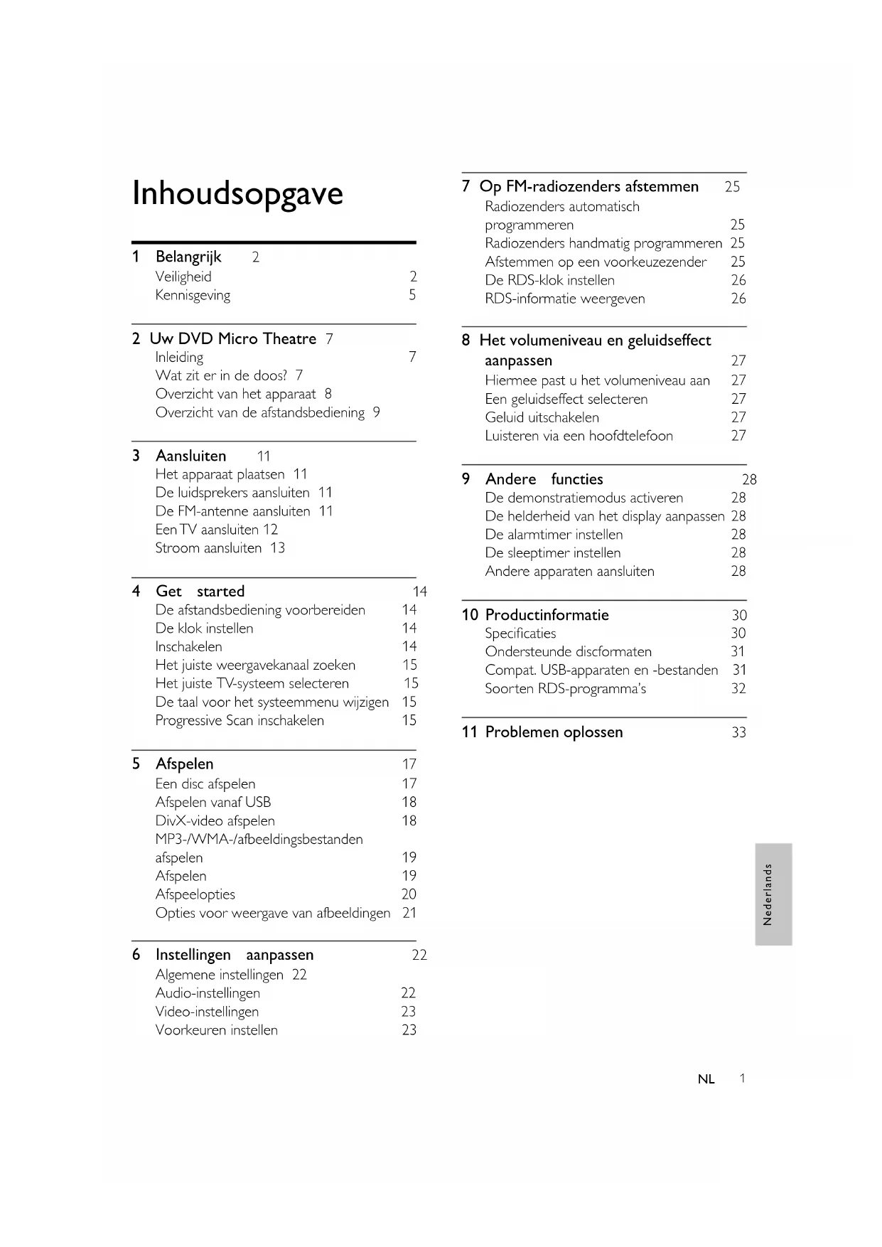 Signaal- ruisverhouding > 65 dB AUX-invoer 500 mV RMS, 20.000 ohm Disc Lasertype Halfgeleider Discdoorsnede 12 cm/8 cm Videodecodering MPEG-1/MPEG-2/DivX Video DAC 12-bits Signaalsysteem PAL/NTSC Videoformaat 4:3/16:9 Video S/N > 48 dB Audio DAC 24-bits/96 kHz Harmonische vervorming < 1% (1 kHz) Frequentierespons 4 Hz - 20 kHz (44,1 kHz) 4 Hz - 22 kHz (48 kHz) 4 Hz - 24 kHz (96 kHz) Signaal- ruisverhouding > 65 dBA NL31 Compat. USB-apparaten en -bestanden Compatibele USB-apparaten: USB-fl ashgeheugen (USB 2.0 of USB 1.1)• USB-fl ashspelers (USB 2.0 of USB 1.1)• geheugenkaarten (een aanvullende • kaartlezer is vereist voor gebruik in combinatie met dit apparaat) Ondersteunde bestandsindelingen: USB of bestandsindeling van geheugen • FAT12, FAT16, FAT32 (sectorformaat: 512 bytes). MP3-bitsnelheid (gegevenssnelheid): 32 - • 320 kbps en variabele bitsnelheid WMA versie 9 of eerder• Mappen met maximaal 8 niveaus• Aantal albums/mappen: maximaal 99• Aantal tracks/titels: maximaal 999• ID3-tag versie 2.0 of later• Bestandsnaam in Unicode UTF8 • (maximumlengte: 128 bytes). Niet-ondersteunde bestandsindelingen: Lege albums: een leeg album is een album • dat geen MP3- of WMA-bestanden bevat. Lege albums worden niet op het display weergegeven. Niet-ondersteunde bestandsindelingen • worden overgeslagen. Zo worden bijvoorbeeld Word-documenten (.doc) of MP3-bestanden met de extensie .dlf genegeerd en niet afgespeeld. AAC-, WAV- en PCM-audiobestanden• WMA-bestanden die beveiligd zijn met • DRM (.wav, .m4a, .m4p, .mp4, .aac) WMA-bestanden in ‘lossless’-indeling• Gewicht - Inclusief verpakking - Apparaat - Luidsprekerbox 11 kg 2 kg 2 x 0,8 kg Ondersteunde discformaten Digital Video Discs (DVD’s)• Video-CD’s (VCD’s)• Super Video-CD’s (SVCD’s)• Digital Video Discs + Rewritable • (DVD+RW’s) Compact Discs (CD’s)• Beeldbestanden (Kodak, JPEG) op CD-• R(W) DivX(R)-discs op CD-R(W):• DivX 3.11, 4.x en 5.x• WMA• Ondersteunde MP3-CD-formaten: ISO 9660• Max. titel/albumnaam: 12 tekens• Max. aantal titels plus album: 255• Max. geneste directory: 8 niveaus• Max. aantal albums: 32• Max. aantal MP3-tracks: 999• Ondersteunde samplefrequenties voor • MP3-discs: 32 kHz, 44,1 kHz, 48 kHz. Ondersteunde bit-rates van MP3-discs: • 32, 64, 96, 128, 192, 256 (kbps). De volgende formaten worden niet • ondersteund: Bestanden zoals *.VMA, *.AAC, • *.DLF, *.M3U, *.PLS en *.WAV• Niet-Engelse album-/titelnaam• Discs die zijn opgenomen in Joliet-• formaat MP3 Pro en MP3 met ID3-tag• Nederlands NL32 Soorten RDS-programma’s NO TYPE Geen RDS- programmasoort NEWS Nieuwsdiensten AFFAIRS Politiek en actualiteiten INFO Speciale informatieve programma’s SPORT Sport EDUCATE Educatieve programma’s DRAMA Hoorspelen en literatuur CULTURE Cultuur, religie en maatschappelijke kwesties SCIENCE Wetenschap VARIED Entertainmentprogramma’s POP M Popmuziek ROCK M Rockmuziek MOR M Lichte muziek LIGHT M Lichte klassieke muziek CLASSICS Klassieke muziek OTHER M Speciale muziekprogramma’s WEATHER Weer FINANCE Financiële programma’s CHILDREN Kinderprogramma’s SOCIAL Sociale onderwerpen RELIGION Godsdienst PHONE IN Inbelprogramma’s TRAVEL Reisprogramma’s LEISURE Vrije tijd JAZZ Jazzmuziek COUNTRY Countrymuziek NATION M Nederlandstalige muziek OLDIES Klassiekers FOLK M Folkmuziek DOCUMENT Documentaires TES Alarmtest ALARM Alarm NL33 Geen beeld Controleer de videoaansluiting.• Zet de TV aan en selecteer het juiste • videokanaal. Progressive Scan is ingeschakeld, maar • de TV biedt geen ondersteuning voor Progressive Scan. Zwart-witbeeld of vervormd beeld De disc komt niet overeen met het • kleurensysteem van de TV (PAL/NTSC). Soms is het beeld enigszins vervormd. Dit • is geen defect. Reinig de disc.• Het beeld kan vervormd zijn tijdens het • instellen van Progressive Scan. Het beeldformaat van het TV-scherm kan niet worden gewijzigd, hoewel het TV- weergaveformaat wel is ingesteld. De beeldverhouding is vastgelegd op de • DVD. De beeldverhouding kan op sommige • TV-systemen niet worden gewijzigd. Geen geluid of matig geluid Pas het volume aan.• Verwijder de hoofdtelefoon.• Controleer of de luidsprekers goed zijn • aangesloten. Controleer of de luidsprekerdraden • zonder isolatie goed zijn vastgeklemd. De afstandsbediening werkt niet Voordat u op een van de functieknoppen • drukt, moet u eerst de juiste bron selecteren met behulp van de afstandsbediening in plaats van het apparaat. Houd de afstandsbediening dichter bij het • apparaat. Plaats de batterij met de polariteiten (te • herkennen aan een plus- of minteken) in de aangegeven positie. Vervang de batterij.• Richt de afstandsbediening rechtstreeks • op de sensor aan de voorkant van het apparaat. 11 Problemen oplossen Let op Verwijder de behuizing van het apparaat nooit.• Probeer het apparaat nooit zelf te repareren. Hierdoor wordt de garantie ongeldig. Als u problemen ondervindt bij het gebruik van dit apparaat, controleer dan het volgende voordat u om service vraagt. Als het probleem onopgelost blijft, gaat u naar de website van Philips (www.philips.com/support). Als u contact opneemt met Philips, zorg er dan voor dat u uw apparaat, het modelnummer en het serienummer bij de hand hebt. Geen stroom Controleer of het netsnoer van het • apparaat goed is aangesloten. Zorg ervoor dat er stroom op het • stopcontact staat. Om energie te besparen, schakelt het • systeem zichzelf automatisch uit als u 15 minuten nadat het afspelen is gestopt, niet op een knop hebt gedrukt. Geen disc gevonden Plaats een disc.• Controleer of de disc misschien • ondersteboven is geplaatst. Wacht tot de condens van de lens is • verdwenen. Plaats de disc opnieuw of maak de disc • schoon. Gebruik een gefi naliseerde CD of • geschikte discindeling. Nederlands NL34 Sommige bestanden op het USB-apparaat kunnen niet worden weergegeven Het aantal mappen of bestanden op het • U