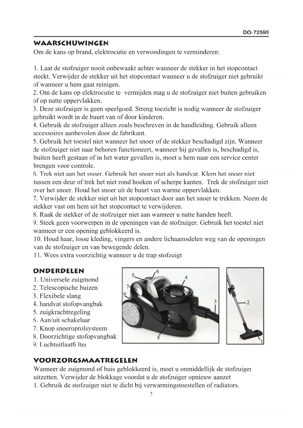 HANDLEIDING MODE D’EMPLOI GEBRAUCHANLEITUNG INSTRUCTION BOOKLET PRODUCT OF STOFZ UIGER ASPIRATEUR STAUBSAUGER VACUUM CLEANER DO-7259SDO-7259S GARANTIEVOORWAARDEN Dit apparaat heeft een garantietermijn van 2 jaar vanaf de datum van aankoop.