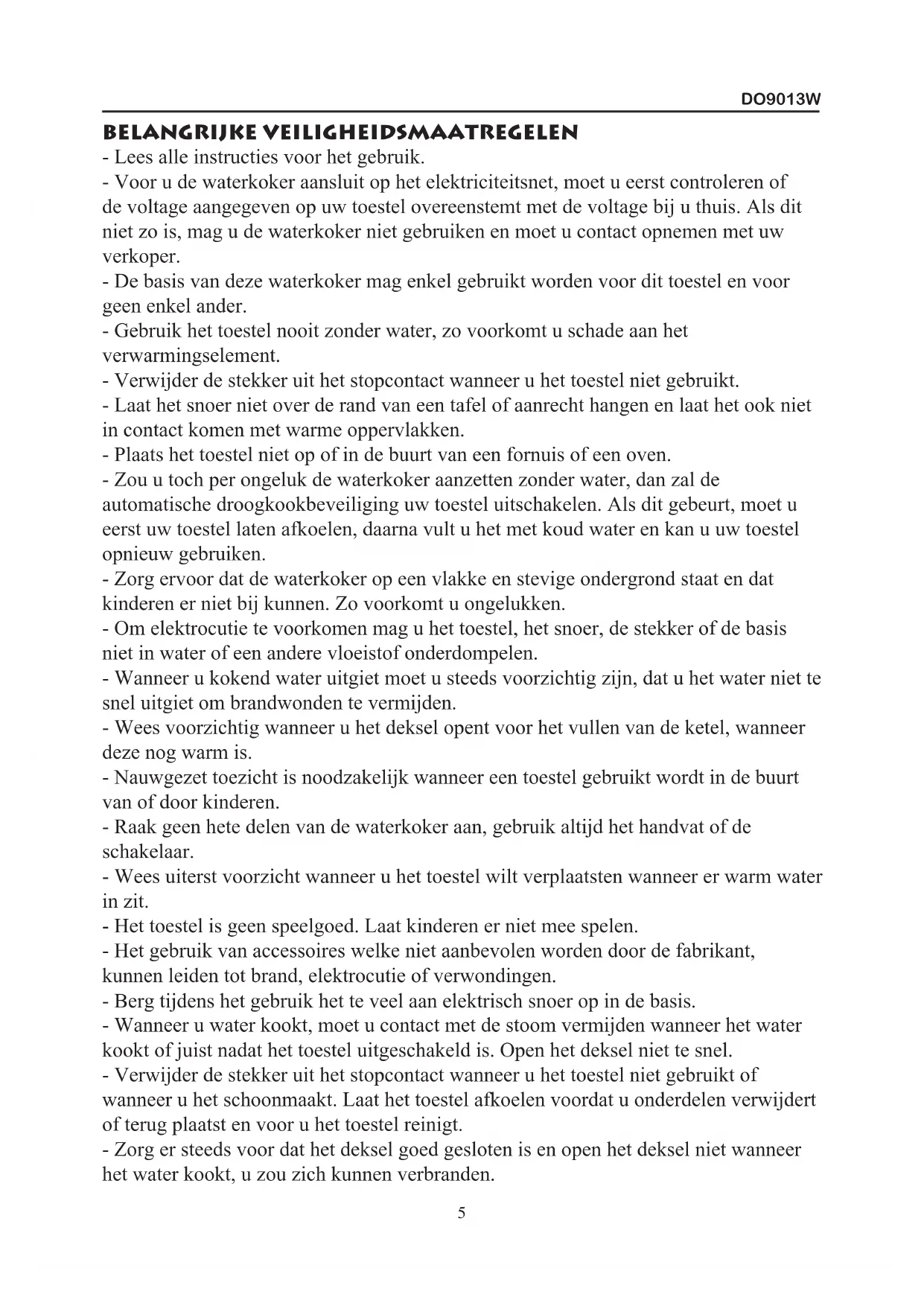 Le symbole sur le produit ou son emballage indique que ce produit ne peut être traité comme déchet ménager. Il doit plutôt être remis au point de ramassage concerné, se chargeant du recyclage du matériel électrique et électronique. En vous assurant que ce produit est éliminé correctement, vous favorisez la prévention des conséquences négatives pour l’environnement et la santé humaine qui, sinon, seraient le résulat d’un traitement inapproprié des déchets de ce produit. Pour obetenie plus de détails sur le récyclage de ce produit, veuillez prendre contact avec le bureau municipal de votre région, votre service d’éliminiation des déchets ménagers ou le magasin où vous avez acheté le produit. RECYCLING INFORMATIONEN Das Symbol auf dem Produkt oder seiner Verpackung weist darauf hin, dass dieses Produkt nicht als normaler Haushaltsabfall zu behandeln ist, sondern an einem Sam- melpunkt für des Recyling von elektrischen und elektronischen Geräten abgegeben werden muss. Durch Ihren Beitrag zum korrekten Entsorgen dieses Produkts schützen Sie die Umwelt und die Gesundheit Ihrer Mitmenschen. Umwelt und Gesundheit werden durch falsches Entsorgen gehährdet. Weitere Informationen über das Recy- cling dieses Produkts erhalten Sie von Ihren Rathaus, Ihrer Müllabfurh oder dem Geschäft, in dem Sie das Produkt gekauft haben. RECYCLING INFORMATION The symbol on the product or on its packaging indicates that this product may not be treated as household waste. Instead it shall be brought to the applicable collection point for recycling of electrical and electronic equipment. By ensuring this product is disposed of correctly, you will help prevent potential negative consequences for the environment and human health, which could otherwise be caused by inappropriate waste handling of this product. For more detailed information about recycling of this product, please contact your local city ofce, your household waste disposal service or the shop where you purchased the product.DO9013W BELANGRIJKE VEILIGHEIDSMAATREGELEN - Lees alle instructies voor het gebruik. - Voor u de waterkoker aansluit op het elektriciteitsnet, moet u eerst controleren of de voltage aangegeven op uw toestel overeenstemt met de voltage bij u thuis. Als dit niet zo is, mag u de waterkoker niet gebruiken en moet u contact opnemen met uw verkoper. - De basis van deze waterkoker mag enkel gebruikt worden voor dit toestel en voor geen enkel ander. - Gebruik het toestel nooit zonder water, zo voorkomt u schade aan het verwarmingselement. - Verwijder de stekker uit het stopcontact wanneer u het toestel niet gebruikt. - Laat het snoer niet over de rand van een tafel of aanrecht hangen en laat het ook niet in contact komen met warme oppervlakken. - Plaats het toestel niet op of in de buurt van een fornuis of een oven. - Zou u toch per ongeluk de waterkoker aanzetten zonder water, dan zal de automatische droogkookbeveiliging uw toestel uitschakelen. Als dit gebeurt, moet u eerst uw toestel laten afkoelen, daarna vult u het met koud water en kan u uw toestel opnieuw gebruiken. - Zorg ervoor dat de waterkoker op een vlakke en stevige ondergrond staat en dat kinderen er niet bij kunnen. Zo voorkomt u ongelukken. - Om elektrocutie te voorkomen mag u het toestel, het snoer, de stekker of de basis niet in water of een andere vloeistof onderdompelen. - Wanneer u kokend water uitgiet moet u steeds voorzichtig zijn, dat u het water niet te snel uitgiet om brandwonden te vermijden. - Wees voorzichtig wanneer u het deksel opent voor het vullen van de ketel, wanneer deze nog warm is. - Nauwgezet toezicht is noodzakelijk wanneer een toestel gebruikt wordt in de buurt van of door kinderen. - Raak geen hete delen van de waterkoker aan, gebruik altijd het handvat of de schakelaar. - Wees uiterst voorzicht wanneer u het toestel wilt verplaatsten wanneer er warm water in zit. - Het toestel is geen speelgoed. Laat kinderen er niet mee spelen. - Het gebruik van accessoires welke niet aanbevolen worden door de fabrikant, kunnen leiden tot brand, elektrocutie of verwondingen. - Berg tijdens het gebruik het te veel aan elektrisch snoer op in de basis. - Wanneer u water kookt, moet u contact met de stoom vermijden wanneer het water kookt of juist nadat het toestel uitgeschakeld is. Open het deksel niet te snel. - Verwijder de stekker uit het stopcontact wanneer u het toestel niet gebruikt of wanneer u het schoonmaakt. Laat het toestel afkoelen voordat u onderdelen verwijdert of terug plaatst en voor u het toestel reinigt. - Zorg er steeds voor dat het deksel goed gesloten is en open het deksel niet wanneer het water kookt, u zou zich kunnen verbranden. 5DO9013W - Wanneer het elektrisch snoer beschadigd is, moet u het laten herstellen door de fabrikant of zijn service center of een gekwaliceerd persoon, om problemen te vermijden. - Gebruik het toestel niet voor andere doeleinden. - Het toestel kan alleen gebruikt worden met de bijgeleverde basis. - Wanneer de waterkoker te vol is, kan er water gemorst worden. - Het toestel is alleen bedoeld voor huishoudelijk gebruik, niet buitenshuis gebruiken. - Bewaar deze instructies. - Dit toestel mag niet gebruikt worden door personen (inclusief kinderen) met een verminderde fysieke, sensoriële of mentale capaciteit, of personen met een gebrek aan ervaring, tenzij deze personen onder toezicht het toestel gebruiken of voldoende informatie hebben gekregen hoe ze het toestel moeten gebruiken van een persoon die instaat voor hun veiligheid. - Kinderen moeten in het oog gehouden worden, om te voorkomen dat ze met het toestel kunnen spelen. Dit toestel is geschikt om te gebruiken in de huishoudelijke omgeving en in gelijkaardige omgevingen zoals : - Keukenhoek voor personeel van winkels, kantoren en andere gelijkaardige professionele omgevingen. - Boerderijen - Hotel- en motelkamers en andere omgevingen met een residentieel karakter. - Gastenkamers, of gelijkaardige Opgelet : het toestel mag niet ge