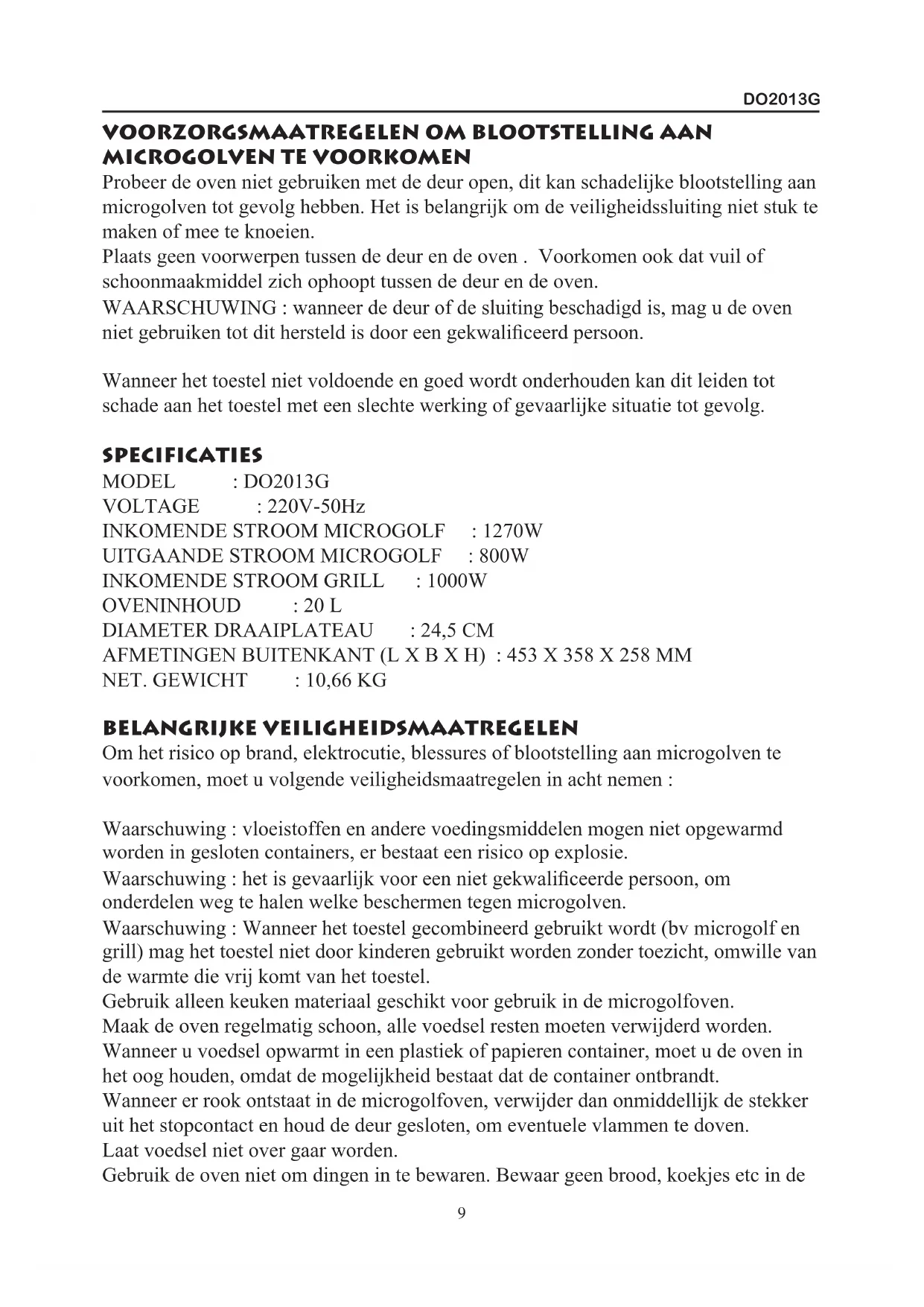 INKOMENDE STROOM MICROGOLF : 1270W UITGAANDE STROOM MICROGOLF : 800W INKOMENDE STROOM GRILL : 1000W OVENINHOUD : 20 L DIAMETER DRAAIPLATEAU : 24,5 CM AFMETINGEN BUITENKANT (L X B X H) : 453 X 358 X 258 MM NET. GEWICHT : 10,66 KG BELANGRIJKE VEILIGHEIDSMAATREGELEN Om het risico op brand, elektrocutie, blessures of blootstelling aan microgolven te