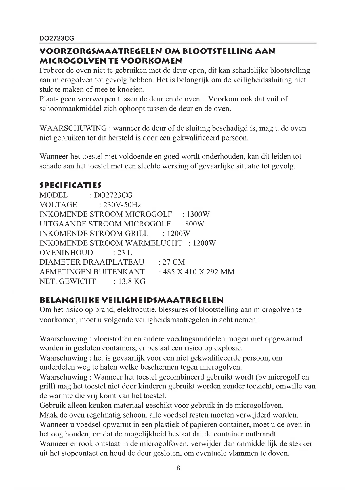 INKOMENDE STROOM MICROGOLF : 1300W UITGAANDE STROOM MICROGOLF : 800W INKOMENDE STROOM GRILL : 1200W INKOMENDE STROOM WARMELUCHT : 1200W OVENINHOUD : 23 L DIAMETER DRAAIPLATEAU : 27 CM AFMETINGEN BUITENKANT : 485 X 410 X 292 MM NET. GEWICHT : 13,8 KG BELANGRIJKE VEILIGHEIDSMAATREGELEN Om het risico op brand, elektrocutie, blessures of blootstelling aan microgolven te