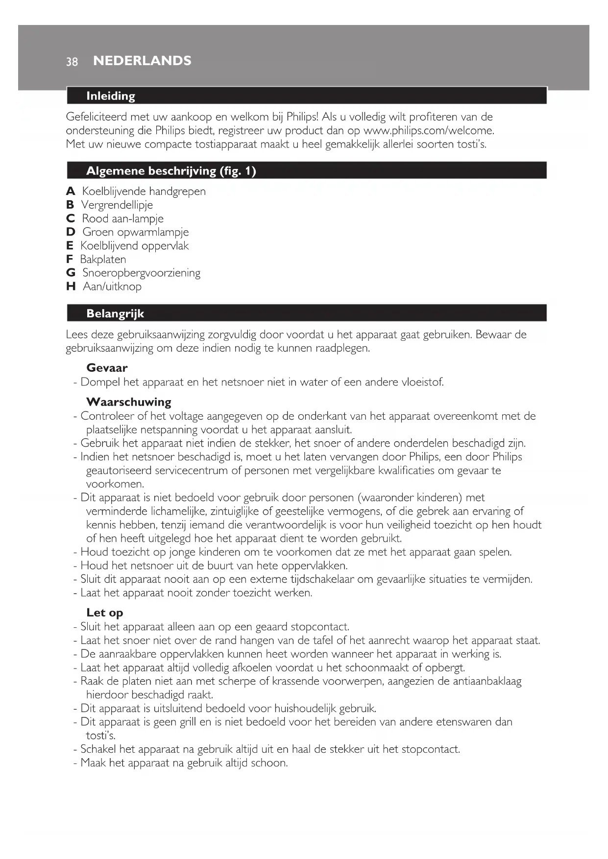 Gefeliciteerd met uw aankoop en welkom bij Philips! Als u volledig wilt proteren van de ondersteuning die Philips biedt, registreer uw product dan op www.philips.com/welcome. Met uw nieuwe compacte tostiapparaat maakt u heel gemakkelijk allerlei soorten tosti’s.