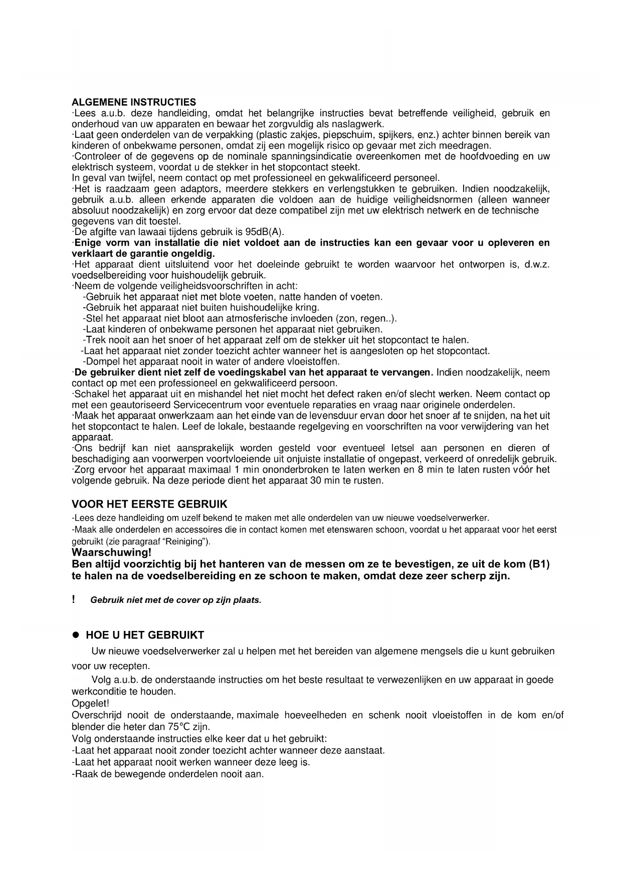 -Lees deze handleiding om uzelf bekend te maken met alle onderdelen van uw nieuwe voedselverwerker. -Maak alle onderdelen en accessoires die in contact komen met etenswaren schoon, voordat u het apparaat voor het eerst gebruikt (zie paragraaf “Reiniging”). Waarschuwing! Ben altijd voorzichtig bij het hanteren van de messen om ze te bevestigen, ze uit de kom (B1) te halen na de voedselbereiding en ze schoon te maken, omdat deze zeer scherp zijn. ! Gebruik niet met de cover op zijn plaats.