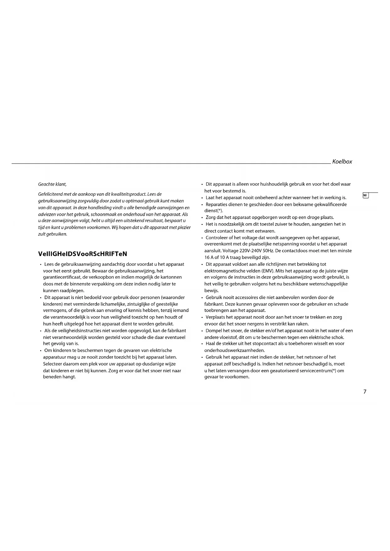 - Gebruikhetapparaatnietindiendestekker,hetnetsnoerofhet apparaatzelfbeschadigdis.Indienhetnetsnoerbeschadigdis,moet uhetlatenvervangendooreengeautoriseerdservicecentrum(*)om gevaartevoorkomen. Koelbox8 Gebruiksaanwijzing