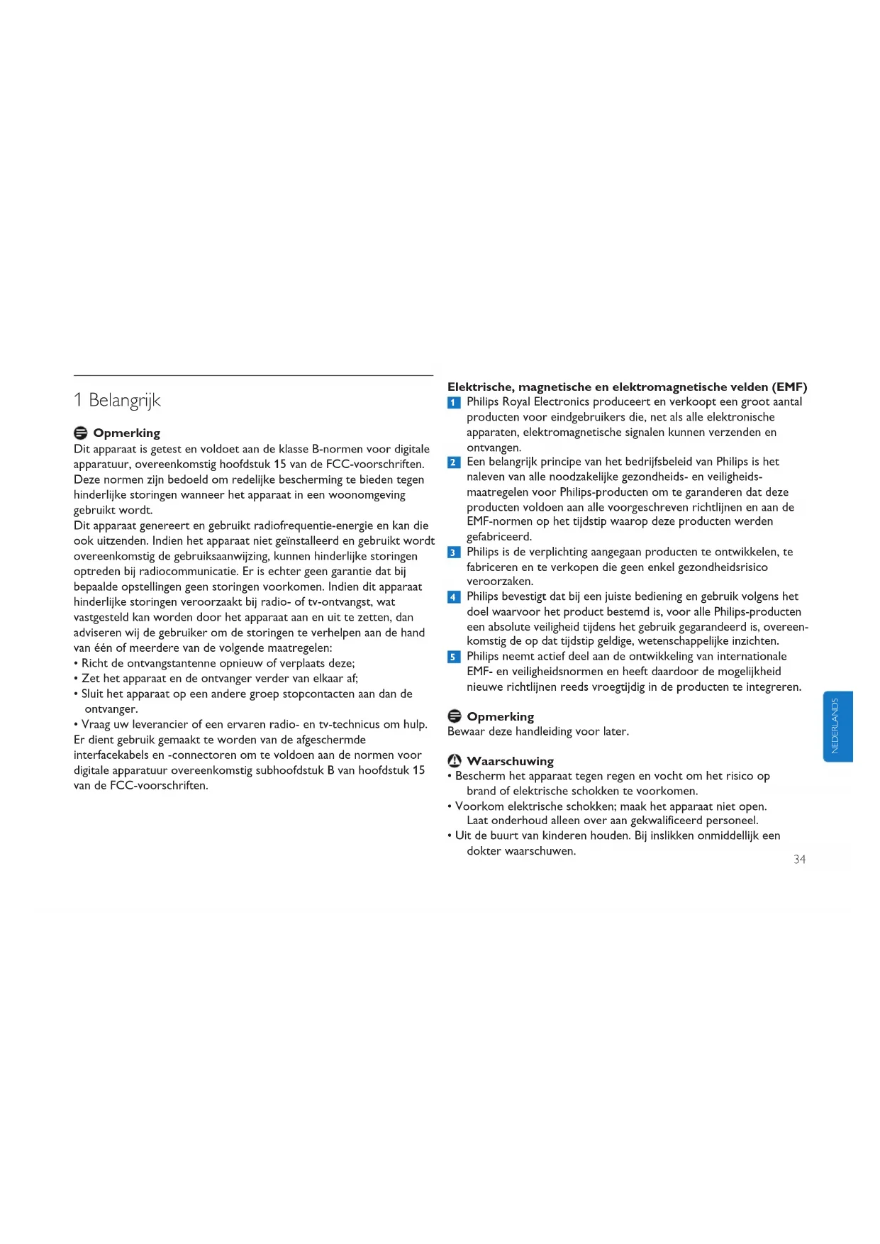 - Vraag uw leverancier of een ervaren radio- en tv-technicus om hulp. Er dient gebruik gemaakt te worden van de afgeschermde interfacekabels en -connectoren om te voldoen aan de normen voor digitale apparatuur overeenkomstig subhoofdstuk B van hoofdstuk 15 van de FCC-voorschriften. Elektrische, magnetische en elektromagnetische velden (EMF) Philips Royal Electronics produceert en verkoopt een groot aantal producten voor eindgebruikers die, net als alle elektronische apparaten, elektromagnetische signalen kunnen verzenden en ontvangen. Een belangrijk principe van het bedrijfsbeleid van Philips is het naleven van alle noodzakelijke gezondheids- en veiligheids- maatregelen voor Philips-producten om te garanderen dat deze producten voldoen aan alle voorgeschreven richtlijnen en aan de EMF-normen op het tijdstip waarop deze producten werden gefabriceerd. Philips is de verplichting aangegaan producten te ontwikkelen, te fabriceren en te verkopen die geen enkel gezondheidsrisico veroorzaken. Philips bevestigt dat bij een juiste bediening en gebruik volgens het doel waarvoor het product bestemd is, voor alle Philips-producten een absolute veiligheid tijdens het gebruik gegarandeerd is, overeen- komstig de op dat tijdstip geldige, wetenschappelijke inzichten. Philips neemt actief deel aan de ontwikkeling van internationale EMF- en veiligheidsnormen en heeft daardoor de mogelijkheid nieuwe richtlijnen reeds vroegtijdig in de producten te integreren. Opmerking Bewaar deze handleiding voor later. Waarschuwing