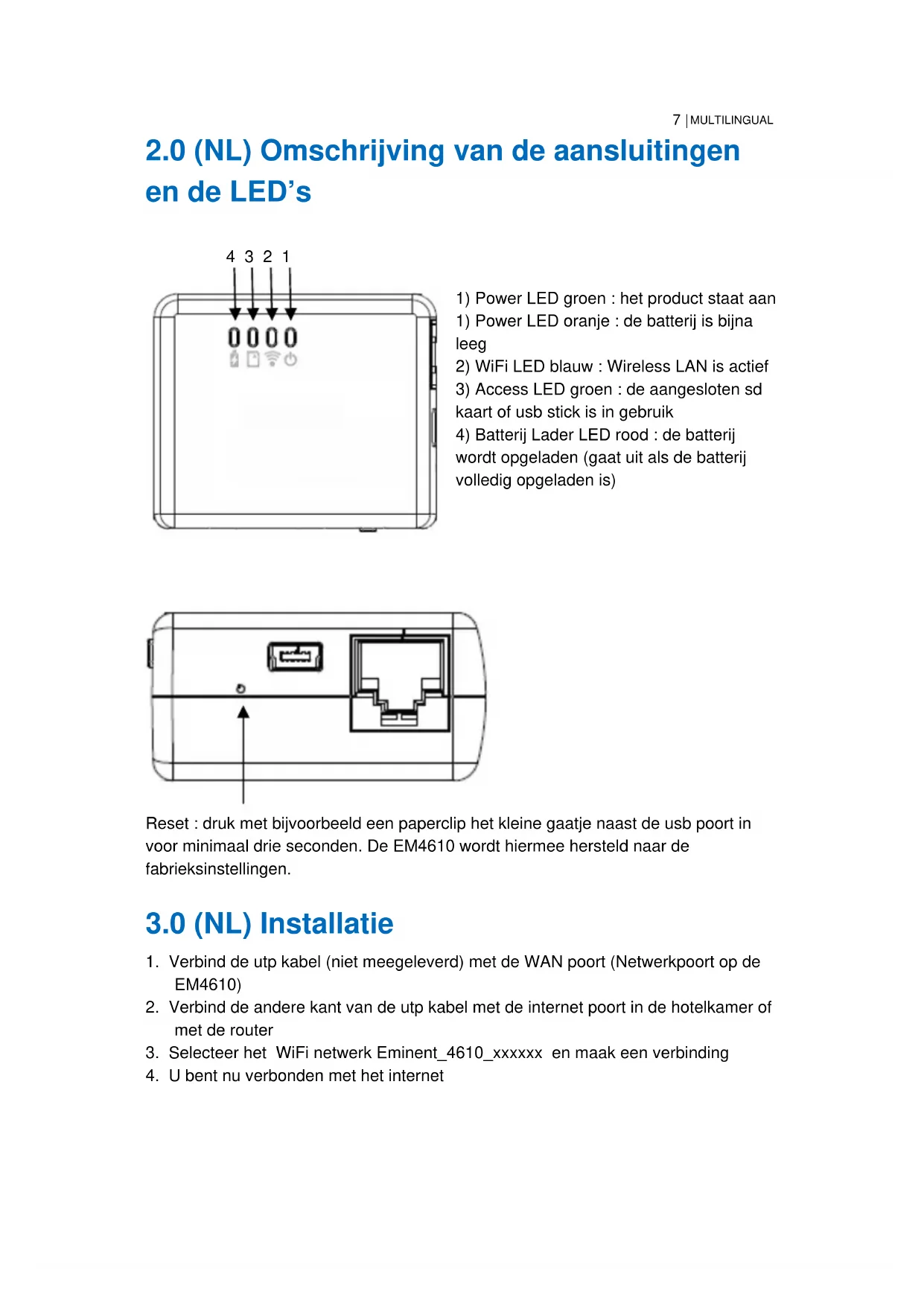 Reset : druk met bijvoorbeeld een paperclip het kleine gaatje naast de usb poort in voor minimaal drie seconden. De EM4610 wordt hiermee hersteld naar de fabrieksinstellingen.