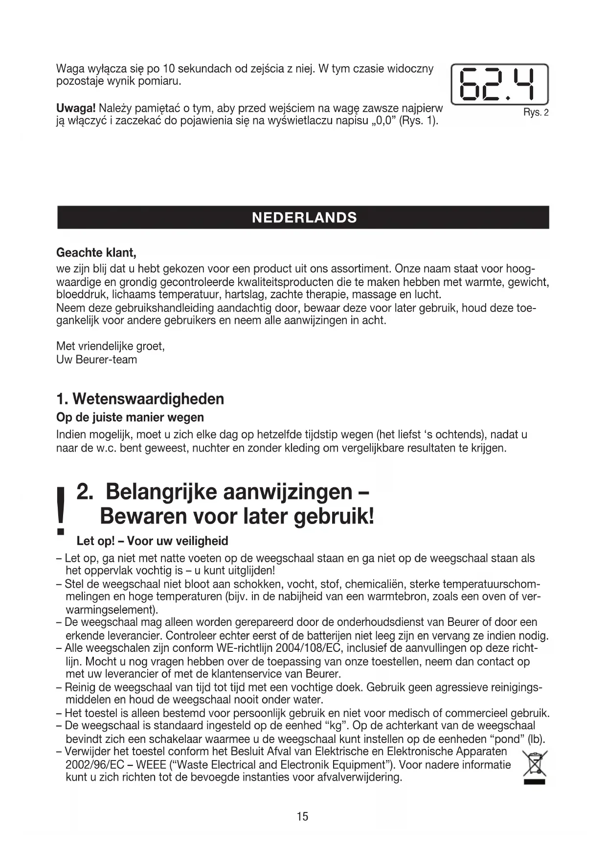 Bewaren voor later gebruik! Let op! – Voor uw veiligheid– Let op, ga niet met natte voeten op de weegschaal staan en ga niet op de weegschaal staan als het oppervlak vochtig is – u kunt uitglijden!– Stel de weegschaal niet bloot aan schokken, vocht, stof, chemicaliën, sterke temperatuurschom-melingen en hoge temperaturen (bijv. in de nabijheid van een warmtebron, zoals een oven of ver-warmingselement).– De weegschaal mag alleen worden gerepareerd door de onderhoudsdienst van Beurer of door een erkende leverancier. Controleer echter eerst of de batterijen niet leeg zijn en vervang ze indien nodig.– Alle weegschalen zijn conform WE-richtlijn 2004/108/EC, inclusief de aanvullingen op deze richt-lijn. Mocht u nog vragen hebben over de toepassing van onze toestellen, neem dan contact op met uw leverancier of met de klantenservice van Beurer.– Reinig de weegschaal van tijd tot tijd met een vochtige doek. Gebruik geen agressieve reinigings-middelen en houd de weegschaal nooit onder water.– Het toestel is alleen bestemd voor persoonlijk gebruik en niet voor medisch of commercieel gebruik.– De weegschaal is standaard ingesteld op de eenhed “kg”. Op de achterkant van de weegschaal bevindt zich een schakelaar waarmee u de weegschaal kunt instellen op de eenheden “pond” (lb).– Verwijder het toestel conform het Besluit Afval van Elektrische en Elektronische Apparaten 2002/96/EC – WEEE (“Waste Electrical and Electronik Equipment”). Voor nadere informatie kunt u zich richten tot de bevoegde instanties voor afvalverwijdering. ! Rys. 2 62.416