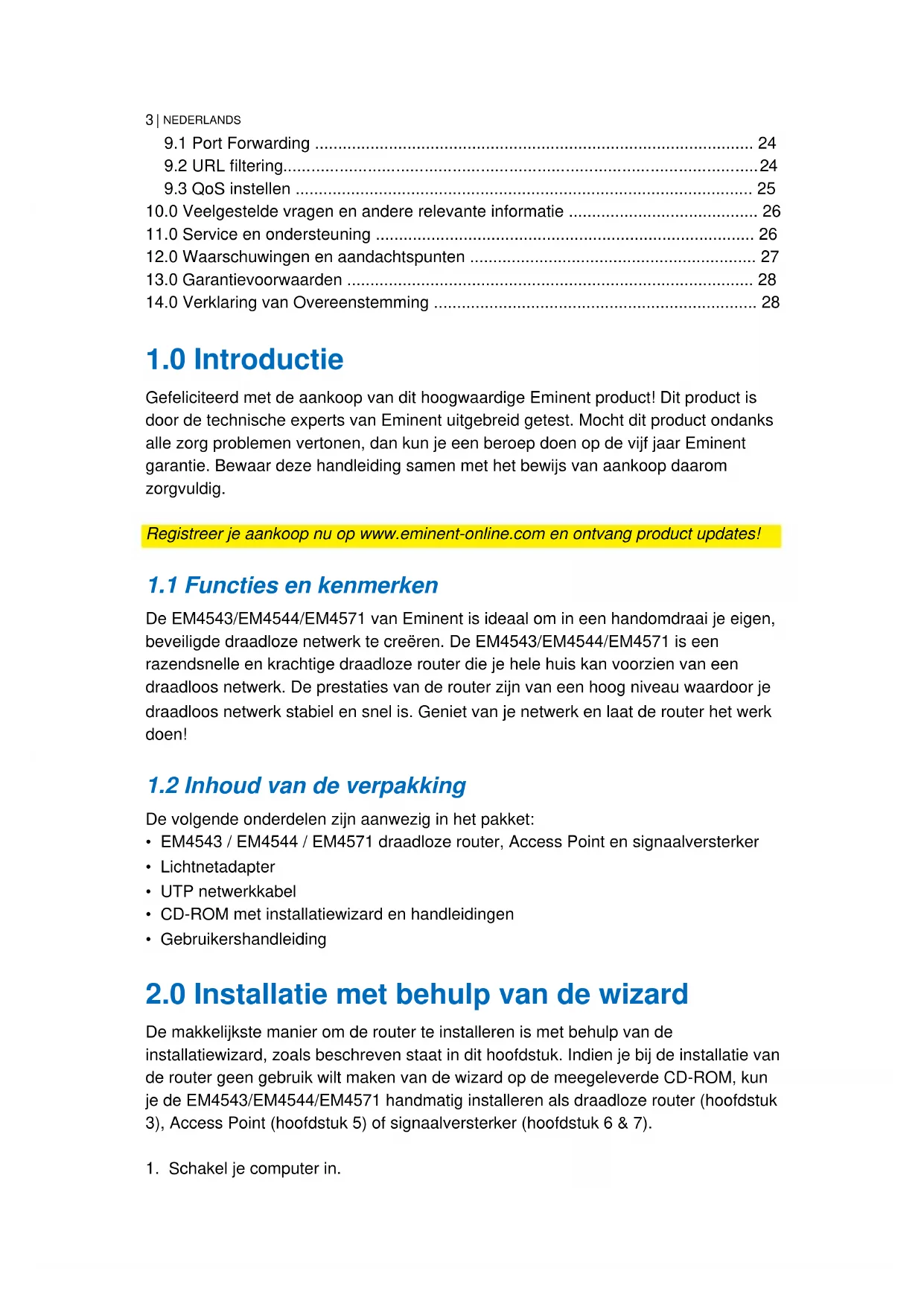 De makkelijkste manier om de router te installeren is met behulp van de installatiewizard, zoals beschreven staat in dit hoofdstuk. Indien je bij de installatie van de router geen gebruik wilt maken van de wizard op de meegeleverde CD-ROM, kun je de EM4543/EM4544/EM4571 handmatig installeren als draadloze router (hoofdstuk 3), Access Point (hoofdstuk 5) of signaalversterker (hoofdstuk 6 & 7).