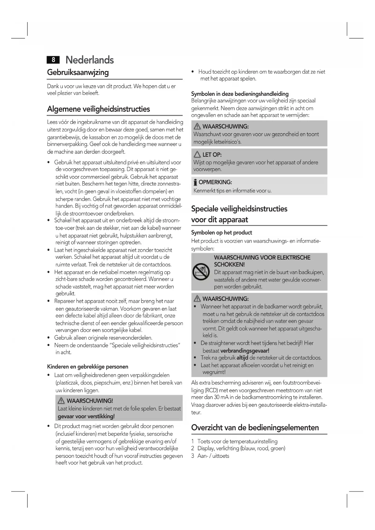 - Laathetapparaatafkoelenvoordatuhetreinigten wegruimt! Als extra bescherming adviseren wij, een foutstroombevei- liging (RCD) met een voorgeschreven meetstroom van niet meer dan 30 mA in de badkamerstroomkring te installeren. Vraag daarover advies bij een geautoriseerde elektra-installa- teur. Overzicht van de bedieningselementen 1 Toets voor de temperatuurinstelling 2 Display, verlichting (blauw, rood, groen) 3 Aan- / uittoetsNederlands