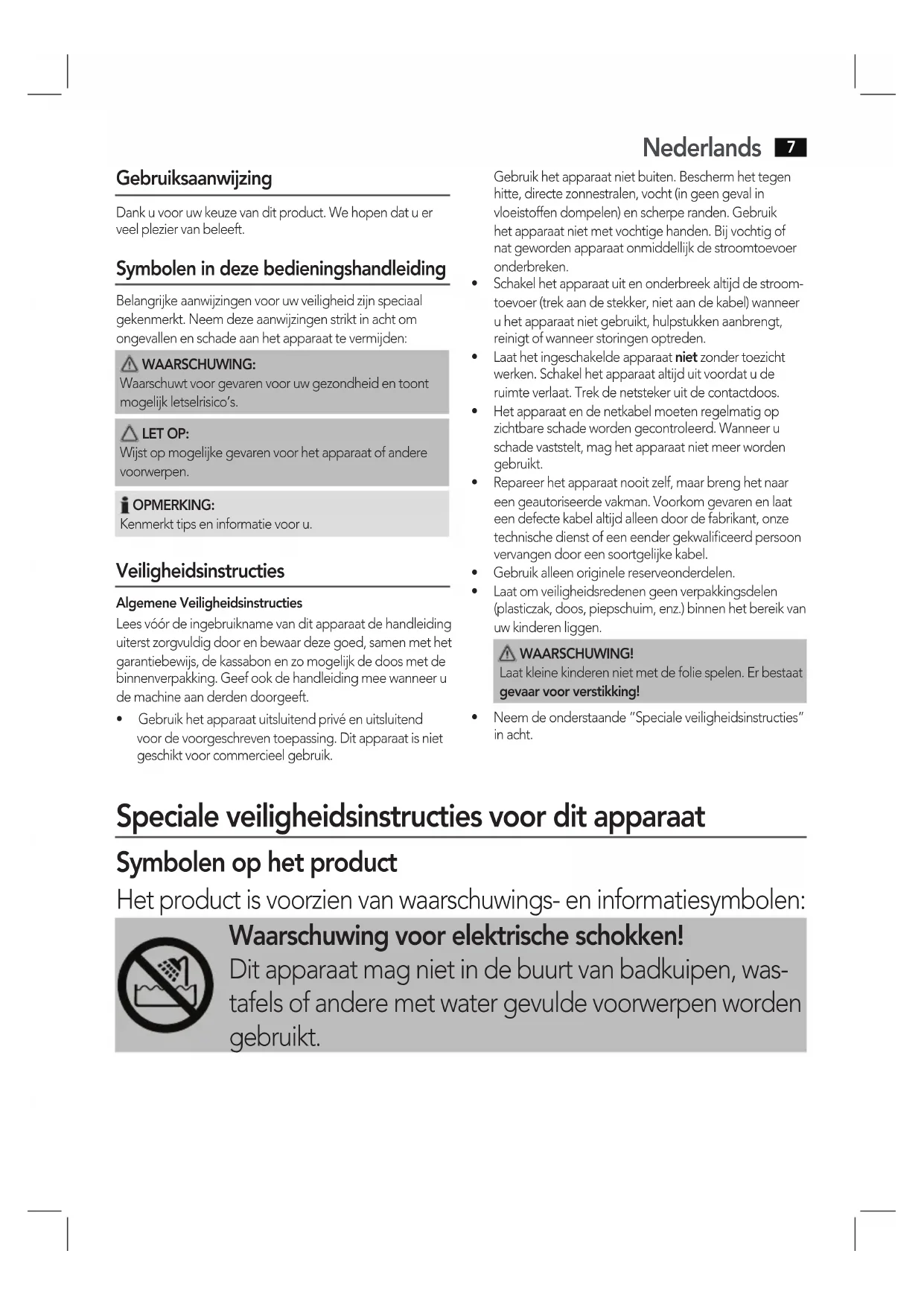 Gebruiksaanwijzing Dank u voor uw keuze van dit product. We hopen dat u er veel plezier van beleeft. Symbolen in deze bedieningshandleiding Belangrijke aanwijzingen voor uw veiligheid zijn speciaal gekenmerkt. Neem deze aanwijzingen strikt in acht om ongevallen en schade aan het apparaat te vermijden: WAARSCHUWING: Waarschuwt voor gevaren voor uw gezondheid en toont mogelijk letselrisico’s. LET OP: Wijst op mogelijke gevaren voor het apparaat of andere voorwerpen. OPMERKING: Kenmerkt tips en informatie voor u. Veiligheidsinstructies Algemene VeiligheidsinstructiesLees vóór de ingebruikname van dit apparaat de handleiding uiterst zorgvuldig door en bewaar deze goed, samen met het garantiebewijs, de kassabon en zo mogelijk de doos met de binnenverpakking. Geef ook de handleiding mee wanneer u de machine aan derden doorgeeft.• Gebruikhetapparaatuitsluitendprivéenuitsluitendvoor de voorgeschreven toepassing. Dit apparaat is niet geschikt voor commercieel gebruik. Gebruik het apparaat niet buiten. Bescherm het tegen hitte, directe zonnestralen, vocht (in geen geval in vloeistoffen dompelen) en scherpe randen. Gebruik het apparaat niet met vochtige handen. Bij vochtig of nat geworden apparaat onmiddellijk de stroomtoevoer onderbreken.• Schakelhetapparaatuitenonderbreekaltddestroom-toevoer (trek aan de stekker, niet aan de kabel) wanneer u het apparaat niet gebruikt, hulpstukken aanbrengt, reinigt of wanneer storingen optreden.• Laathetingeschakeldeapparaatniet zonder toezicht werken. Schakel het apparaat altijd uit voordat u de ruimte verlaat. Trek de netsteker uit de contactdoos.• Hetapparaatendenetkabelmoetenregelmatigopzichtbare schade worden gecontroleerd. Wanneer u schade vaststelt, mag het apparaat niet meer worden gebruikt.• Repareerhetapparaatnooitzelf,maarbrenghetnaareen geautoriseerde vakman. Voorkom gevaren en laat een defecte kabel altijd alleen door de fabrikant, onze technische dienst of een eender gekwalificeerd persoon vervangen door een soortgelijke kabel.• Gebruikalleenoriginelereserveonderdelen.• Laatomveiligheidsredenengeenverpakkingsdelen(plasticzak, doos, piepschuim, enz.) binnen het bereik van uw kinderen liggen. WAARSCHUWING! Laat kleine kinderen niet met de folie spelen. Er bestaat gevaar voor verstikking!• Neemdeonderstaande“Specialeveiligheidsinstructies”in acht. Speciale veiligheidsinstructies voor dit apparaat Symbolen op het product Het product is voorzien van waarschuwings- en informatiesymbolen: Waarschuwing voor elektrische schokken! Dit apparaat mag niet in de buurt van badkuipen, was- tafels of andere met water gevulde voorwerpen worden gebruikt.Nederlands
