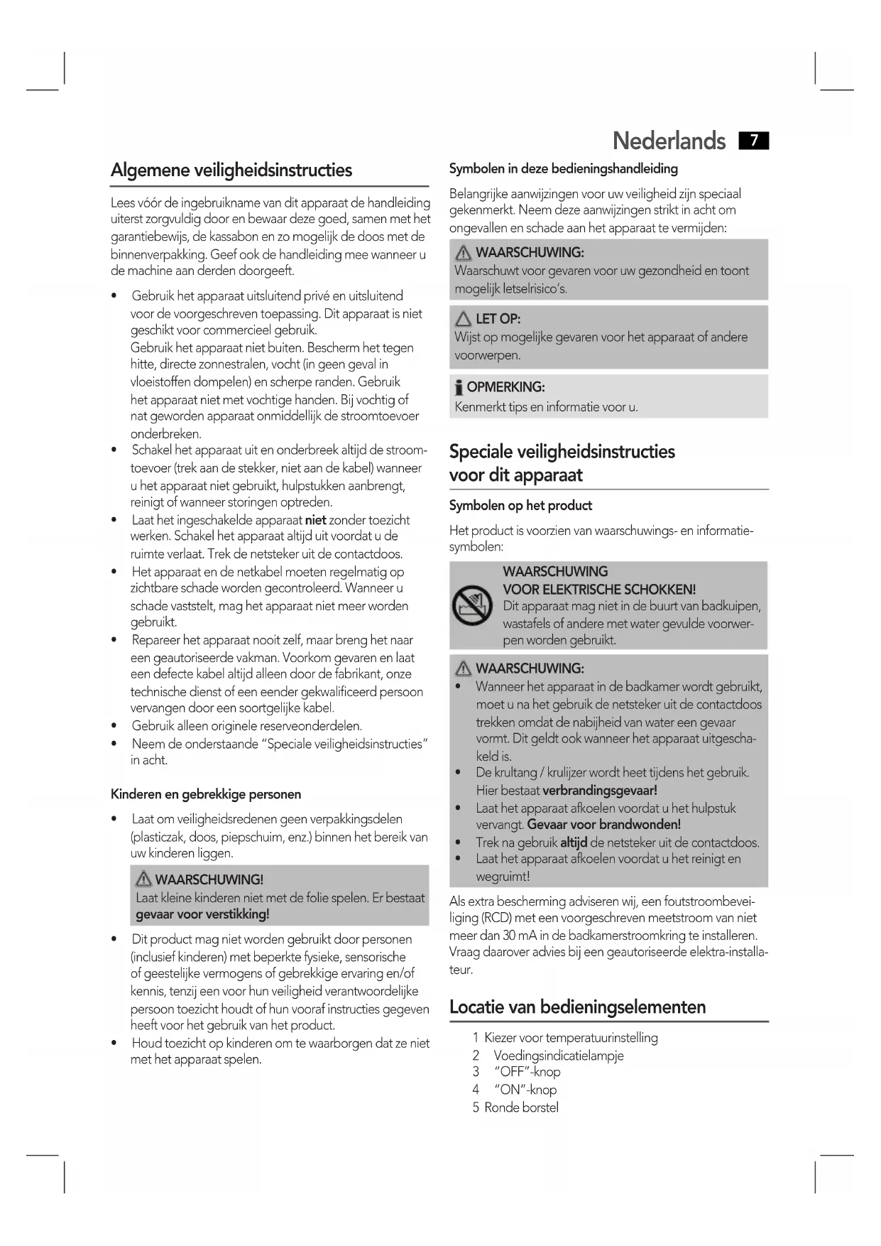 - Laathetapparaatafkoelenvoordatuhetreinigten wegruimt! Als extra bescherming adviseren wij, een foutstroombevei- liging (RCD) met een voorgeschreven meetstroom van niet meer dan 30 mA in de badkamerstroomkring te installeren. Vraagdaaroveradviesbeengeautoriseerdeelektra-installa- teur. Locatie van bedieningselementen 1 Kiezer voor temperatuurinstelling 2 Voedingsindicatielampje 3 “OFF”-knop 4 “ON”-knop 5 Ronde borstelNederlands