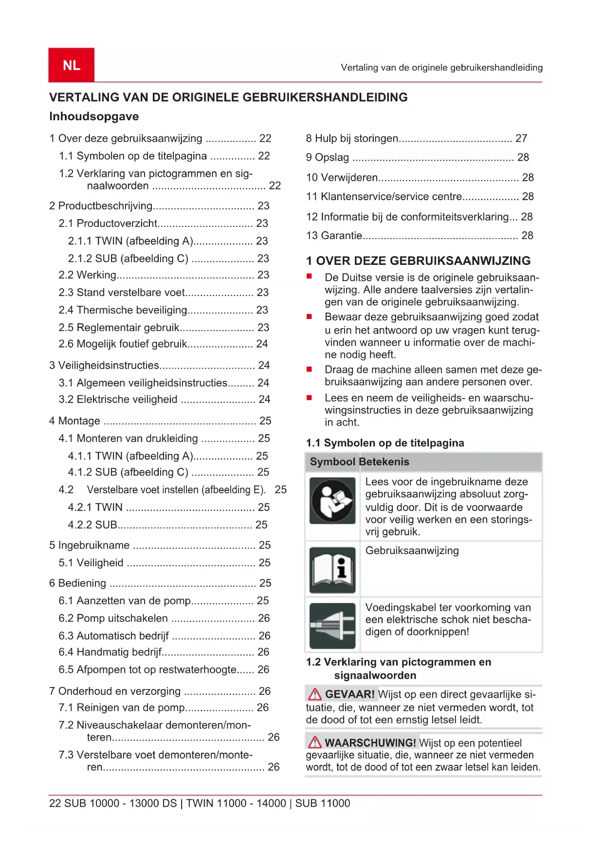 signaalwoorden GEVAAR! Wijst op een direct gevaarlijke si- tuatie, die, wanneer ze niet vermeden wordt, tot de dood of tot een ernstig letsel leidt. WAARSCHUWING! Wijst op een potentieel gevaarlijke situatie, die, wanneer ze niet vermeden wordt, tot de dood of tot een zwaar letsel kan leiden.467772_j 23 Productbeschrijving VOORZICHTIG! Wijst op een potentieel ge- vaarlijke situatie, die, wanneer ze niet vermeden wordt, tot een licht of middelzwaar letsel kan lei- den. LET OP! Wijst op een situatie, die, wanneer ze niet vermeden wordt, tot materiële schade kan leiden. OPMERKING Speciale aanwijzingen voor meer duidelijkheid en een beter gebruik. 2 PRODUCTBESCHRIJVING In deze gebruikershandleiding worden verschil- lende pompmodellen beschreven. U kunt uw mo- del identificeren aan de hand van het typeplaatje.