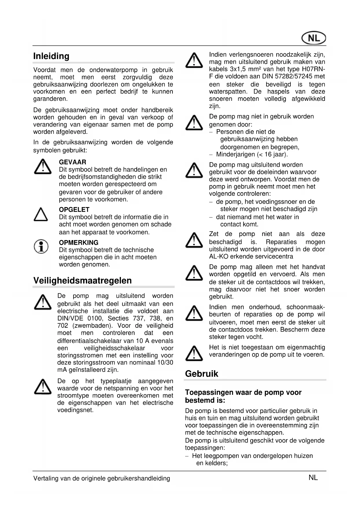 Voordat men ook maar enige ingreep op de pomp uitvoert om storingen te verhelpen moet de steker van de pomp uit de contactdoos zijn getrokken. Probleem Oorzaak Oplossing De motor draait niet Schoepenrad geblokkeerd Haal het blokkerende object uit het aanzuiggedeelte. De thermische schakelaar is afgeslagen Wacht tot de thermische schakelaar de pomp weer laat lopen. Controleer de water- temperatuur. Laat de pomp nakijken. Geen netspanning Laat het voedingsnet door een gespecialiseerde electriciën controleren. De vlotterschakelaar werkt niet als het waterniveau stijgt. Stuur de pomp naar een Servicecentrum van AL-KO. De pomp draait maar geeft geen water Lucht in het pomplichaam Laat de lucht ontsnappen door de pomp enigszins schuin te houden Aanzuiggedeelte verstopt Vuil uit aanzuiggedeelte verwijderen Uitlaatsysteem afgesloten Uitlaatsysteem open maken Uitlaatslang geknikt Haal de knik uit de slang Er komt te weinig water uit de pomp Diameter van de slang te klein Grotere uitlaatslang nemen Aanzuiggedeelte verstopt Vuil uit aanzuiggedeelte verwijderen Stuwhoogte te groot Stuwhoogte verminderen Als het niet lukt om de problemen te verhelpen, wordt aangeraden om zich tot het dichtstbijzijnde Servicecentrum van AL-KO te wenden. NL 4 Vertaling van de originele gebruikershandleidingIndledning Kære kunde. Vi ønsker Dem tillykke med anskaffelsen af denne kvalitets-dykpumpe fra AL-KO. For en korrekt og problemfri drift er det yderst vigtigt at læse denne betjeningsvejledning grun- digt igennem og at følge anvisningerne nøje. Opbevar betjeningsvejledningen indenfor rækkevidde og videregiv denne til eventuelle andre brug-erer. I betjeningsvejledningen er anvendt symboler, hvis betydning er forklaret her: