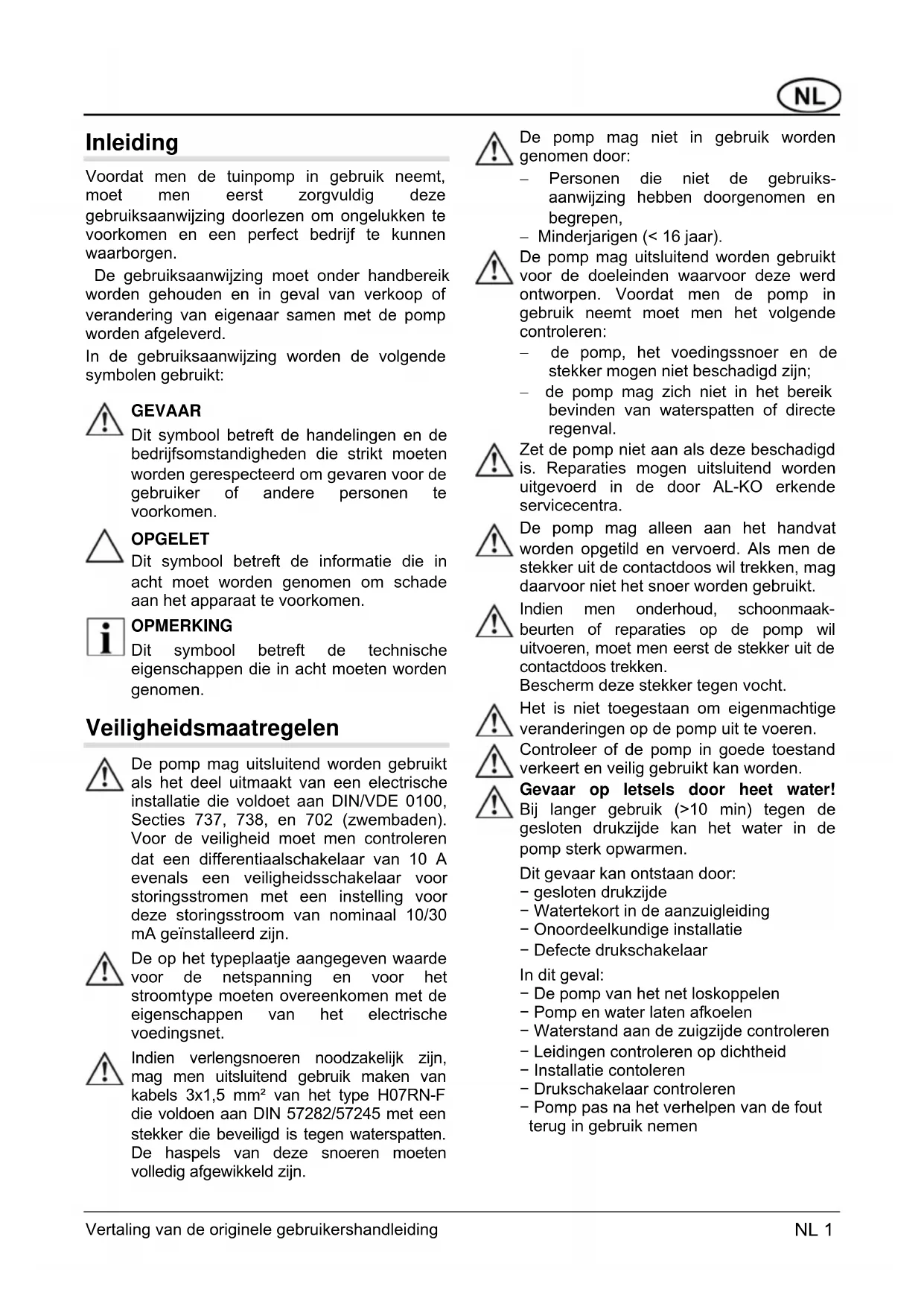 GEVAAR Dit symbool betreft de handelingen en de bedrijfsomstandigheden die strikt moeten worden gerespecteerd om gevaren voor de gebruiker of andere personen te voorkomen. OPGELET Dit symbool betreft de informatie die in acht moet worden genomen om schade aan het apparaat te voorkomen. OPMERKING Dit symbool betreft de technische eigenschappen die in acht moeten worden genomen. Veiligheidsmaatregelen De pomp mag uitsluitend worden gebruikt als het deel uitmaakt van een electrische installatie die voldoet aan DIN/VDE 0100, Secties 737, 738, en 702 (zwembaden). Voor de veiligheid moet men controleren dat een differentiaalschakelaar van 10 A evenals een veiligheidsschakelaar voor storingsstromen met een instelling voor deze storingsstroom van nominaal 10/30 mA geïnstalleerd zijn. De op het typeplaatje aangegeven waarde voor de netspanning en voor het stroomtype moeten overeenkomen met de eigenschappen van het electrische voedingsnet. Indien verlengsnoeren noodzakelijk zijn, mag men uitsluitend gebruik maken van kabels 3x1,5 mm² van het type H07RN-F die voldoen aan DIN 57282/57245 met een stekker die beveiligd is tegen waterspatten. De haspels van deze snoeren moeten volledig afgewikkeld zijn. De pomp mag niet in gebruik worden genomen door: − Personen die niet de gebruiks- aanwijzing hebben doorgenomen en begrepen, − Minderjarigen (< 16 jaar). De pomp mag uitsluitend worden gebruikt voor de doeleinden waarvoor deze werd ontworpen. Voordat men de pomp in gebruik neemt moet men het volgende controleren: − de pomp, het voedingssnoer en de stekker mogen niet beschadigd zijn; − de pomp mag zich niet in het bereik bevinden van waterspatten of directe regenval. Zet de pomp niet aan als deze beschadigd is. Reparaties mogen uitsluitend worden uitgevoerd in de door AL-KO erkende servicecentra. De pomp mag alleen aan het handvat worden opgetild en vervoerd. Als men de stekker uit de contactdoos wil trekken, mag daarvoor niet het snoer worden gebruikt. Indien men onderhoud, schoonmaak- beurten of reparaties op de pomp wil uitvoeren, moet men eerst de stekker uit de contactdoos trekken. Bescherm deze stekker tegen vocht. Het is niet toegestaan om eigenmachtige veranderingen op de pomp uit te voeren. Controleer of de pomp in goede toestand verkeert en veilig gebruikt kan worden. Gevaar op letsels door heet water! Bij langer gebruik (>10 min) tegen de gesloten drukzijde kan het water in de pomp sterk opwarmen. Dit gevaar kan ontstaan door: − gesloten drukzijde − Watertekort in de aanzuigleiding − Onoordeelkundige installatie − Defecte drukschakelaar In dit geval: − De pomp van het net loskoppelen − Pomp en water laten afkoelen − Waterstand aan de zuigzijde controleren − Leidingen controleren op dichtheid − Installatie contoleren − Drukschakelaar controleren − Pomp pas na het verhelpen van de fout terug in gebruik nemen Vertaling van de originele gebruikershandleiding NL 1Gebruik NL 2 Vertaling van de originele gebruikershandleiding Toepassingen waar de pomp voor bestemd is De pomp is bestemd voor particulier gebruik in huis en tuin en mag uitsluitend worden gebruikt voor toepassingen die in overeenstemming zijn met de technische eigenschappen. De pomp is uitsluitend geschikt voor de volgende toepassingen: − Irrigatie en besproeing (bijvoorbeeld voor openbare tuinen, bloemperken en andere tuinen); − Het leegpompen van reservoirs of voor het overpompen (van bijvoorbeeld zwembaden); − Het afwateren van putten, leegpompen van regentonnen of watertanken. − De pomp is uitsluitend geschikt voor de volgende vloeistoffen: − schoon water; − regenwater; − water met chloor (van bijvoorbeeld zwembaden). Niet toegestane toepassingen De pomp moet niet onafgebroken werken. Niet toegestane vloeistoffen: − drinkwater; − zout water; − vloeibare voedingsmiddelen; − rioolslijk; − chemische en corrosieve stoffen; − zuren, ontvlambare explosieve of vluchtige stoffen; − vloeistoffen met een temperatuur van boven 35°C; − water met zand of andere schurende middelen. Beschrijving van de pomp Tuinpomp/toebehoren (afbeeldingen A, B, C) 1 Inlaatopening/aansluiting van de inlaatslang 2 Vuldop 3 Uitlaatopening/aansluiting uitlaatslang 4 Motorbehuizing 5 Voedingssnoer 6 Schakelaar ON/OFF 7 Pompbasis 8 Pompbehuizing 9 Aftapschroef pompkamer 10 Aftapschroef filterkamer 11 Transparant filterdeksel 12 Pakkingen voor filter 13 Filter 14 Terugslagklep 15 Pakking 16 Ronde pakkingring (transparant deksel voor filterkamer) 17 Vlakke pakking 18 Kniekoppeling 19 Vlakke pakking 20 Verbindingsstuk 21 Ronde pakkingring 22 Uitlaatslang (toebehoren) 23 Aanzuigkit (toebehoren) Filtersleutel (afbeelding B)