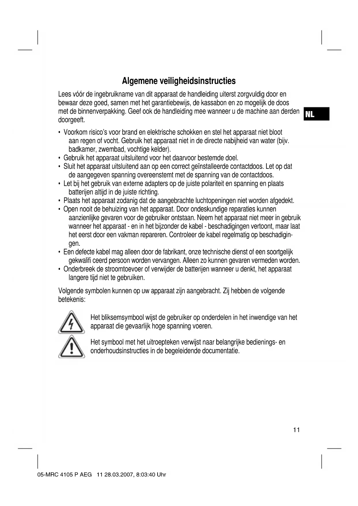 vloeistof in het apparaat binnendringt, kan ernstige schade ontstaan. 05-MRC 4105 P AEG 12 28.03.2007, 8:03:41 UhrNL