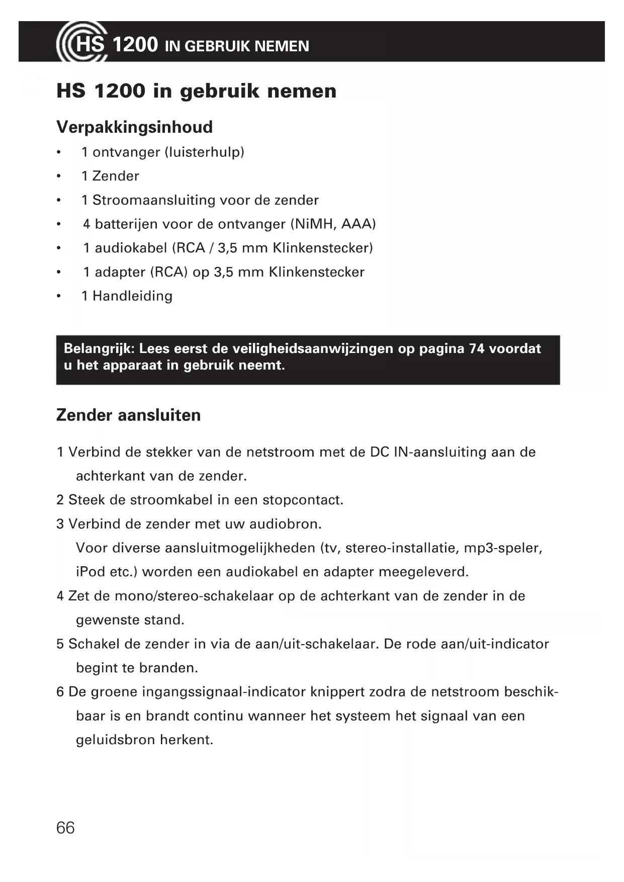 Ontvanger 1 Hoofdbeugel 2 Regelaar voor hoofdbeugel 3 Oorkussen 4 Volumeregeling links 5 Ontvangstindicator (groen) 6 Knop voor klankinstelling 7 Vergrendeling batterijvak 8 Deksel batterijvak 9 Volumeregeling rechts 10 Aan/uit-indicator (rood) 11 Aan/uit-schakelaar Zender 1 Zenderbehuizing 2 Opbergvak voor reservebatterijen 3 Batterij-indicator 4 Indicator ingangssignaal (groen) 5 Aan/uit-indicator (rood) 6 RCA-ingang 7 Mono/stereo-schakelaar 8 Ingang voor adapter 9 Aan/uit-schakelaar65 HS 1200 in gebruik nemenHS 1200 in gebruik nemen Verpakkingsinhoud