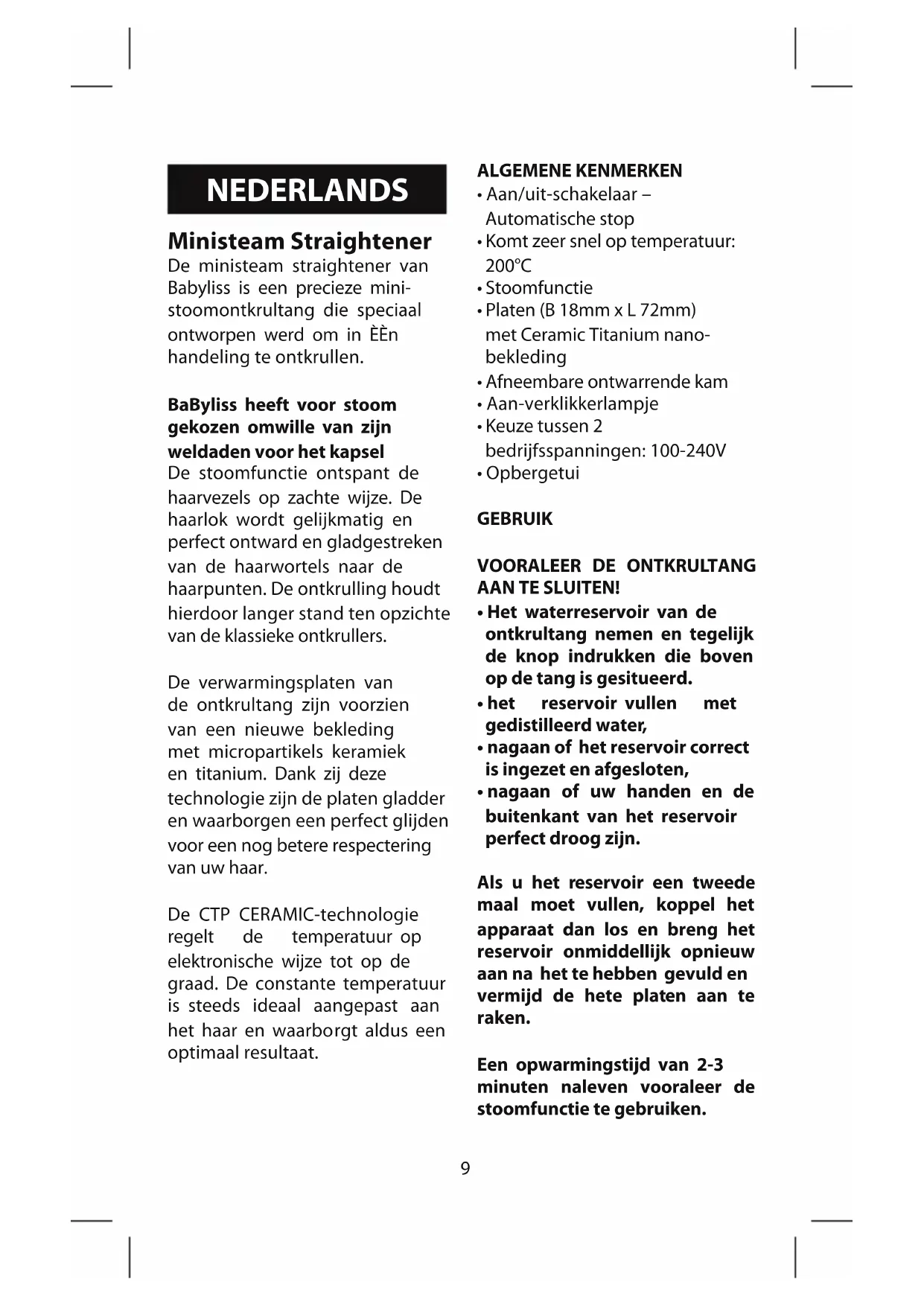 - Füllen Sie den Wasserbehälter vorzugsweise mit destilliertem Wasser. Andernfalls sollte das Gerät regelmäßig entkalkt werden.9 Ministeam Straightener De ministeam straightener van Babyliss is een precieze mini- stoomontkrultang die speciaal ontworpen werd om in ÈÈn handeling te ontkrullen. BaByliss heeft voor stoom gekozen omwille van zijn weldaden voor het kapsel De stoomfunctie ontspant de haarvezels op zachte wijze. De haarlok wordt gelijkmatig en perfect ontward en gladgestreken van de haarwortels naar de haarpunten. De ontkrulling houdt hierdoor langer stand ten opzichte van de klassieke ontkrullers. De verwarmingsplaten van de ontkrultang zijn voorzien van een nieuwe bekleding met micropartikels keramiek en titanium. Dank zij deze technologie zijn de platen gladder en waarborgen een perfect glijden voor een nog betere respectering van uw haar. De CTP CERAMIC-technologie regelt de temperatuur op elektronische wijze tot op de graad. De constante temperatuur is steeds ideaal aangepast aan het haar en waarborgt aldus een optimaal resultaat. ALGEMENE KENMERKEN