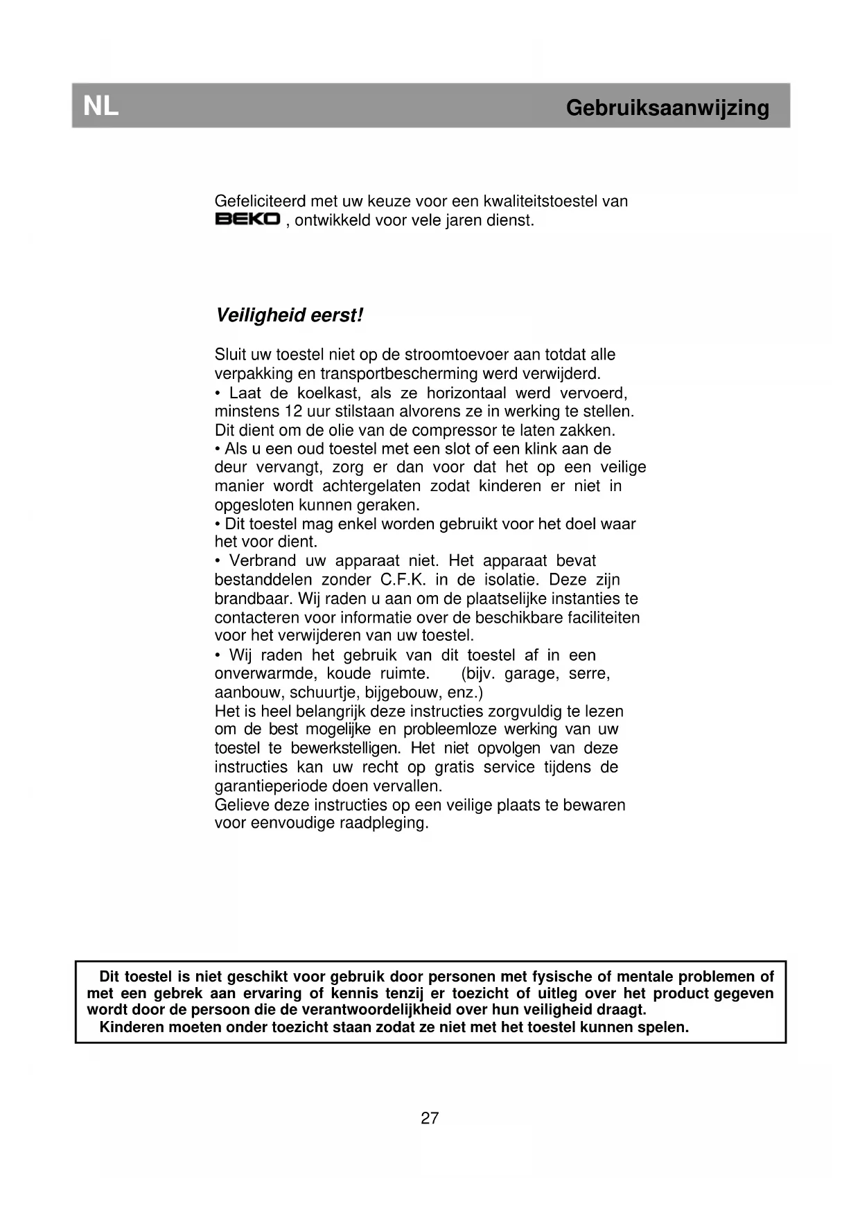 Dit toestel is niet geschikt voor gebruik door personen met fysische of mentale problemen of