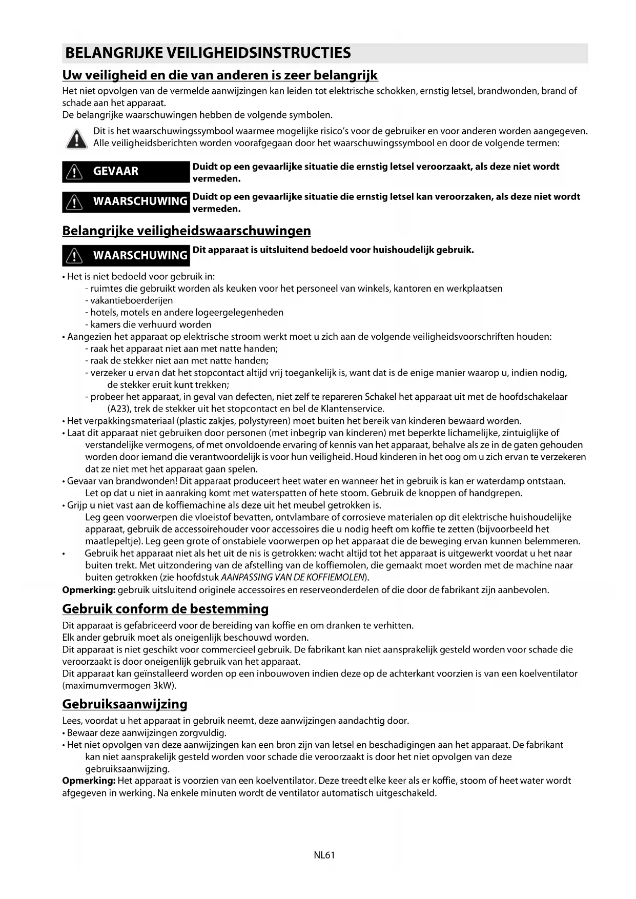 - Het niet opvolgen van deze aanwijzingen kan een bron zijn van letsel en beschadigingen aan het apparaat. De fabrikant kan niet aansprakelijk gesteld worden voor schade die veroorzaakt is door het niet opvolgen van deze gebruiksaanwijzing. Opmerking: Het apparaat is voorzien van een koelventilator. Deze treedt elke keer als er koffie, stoom of heet water wordt afgegeven in werking. Na enkele minuten wordt de ventilator automatisch uitgeschakeld. BELANGRIJKE VEILIGHEIDSINSTRUCTIES Dit is het waarschuwingssymbool waarmee mogelijke risico’s voor de gebruiker en voor anderen worden aangegeven. Alle veiligheidsberichten worden voorafgegaan door het waarschuwingssymbool en door de volgende termen: GEVAAR Duidt op een gevaarlijke situatie die ernstig letsel veroorzaakt, als deze niet wordt vermeden. WAARSCHUWING Duidt op een gevaarlijke situatie die ernstig letsel kan veroorzaken, als deze niet wordt vermeden. WAARSCHUWING Dit apparaat is uitsluitend bedoeld voor huishoudelijk gebruik.NL62 Controle van het transport Verzeker u ervan, nadat u de verpakking verwijderd hebt, dat het apparaat intact is en dat alle accessoires aanwezig zijn. Gebruik het apparaat niet als het duidelijk beschadigd is. Neem contact op met de Klantenservice. Installatie van het apparaat Aansluiting van het apparaat Sluit het apparaat alleen aan op een stopcontact dat conform de voorschriften geïnstalleerd is en dat een minimumvermogen heeft van 10A en voorzien is van efficiënte aarding. Als de stekker en het stopcontact niet van hetzelfde type zijn, laat het stopcontact dan vervangen door een gekwalificeerd vakman. De veiligheidsvoorschriften vereisen dat tijdens de installatie gebruik gemaakt wordt van een omnipolaire schakelaar met een minimumafstand van 3 mm tussen de contacten. Gebruik geen meervoudige stopcontacten of verlengsnoeren. Het apparaat is in overeenstemming met de volgende EG-richtlijnen: