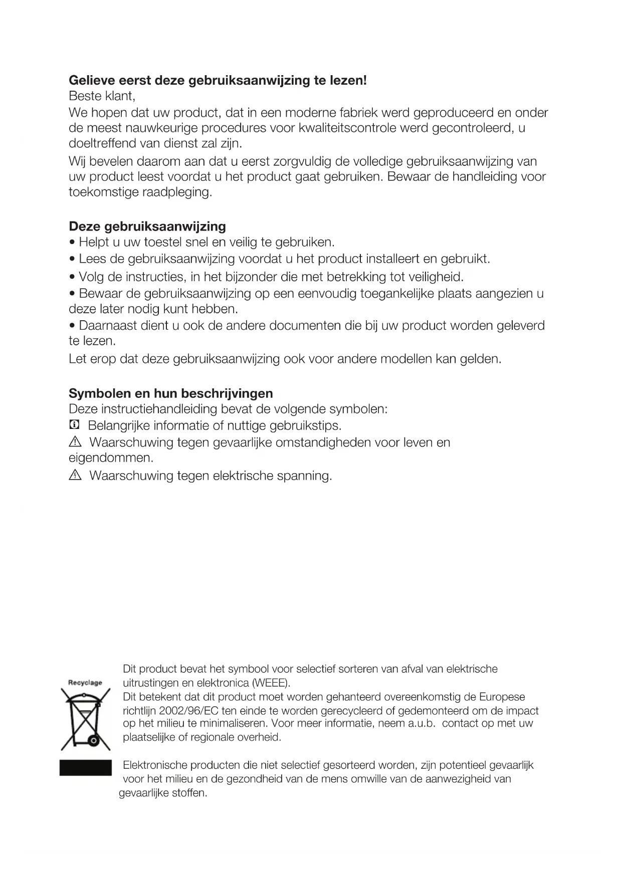 Wij bevelen daarom aan dat u eerst zorgvuldig de volledige gebruiksaanwijzing van