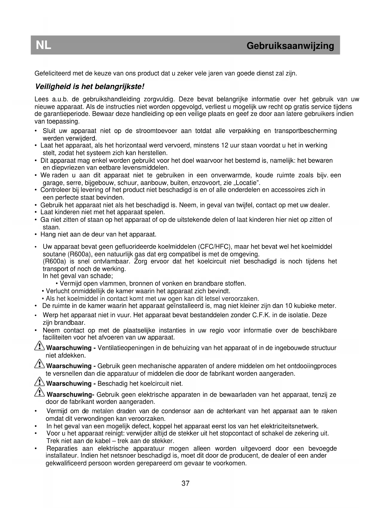 • Uw apparaat bevat geen gefluorideerde koelmiddelen (CFC/HFC), maar het bevat wel het koelmiddel soutane (R600a), een natuurlijk gas dat erg compatibel is met de omgeving. (R600a) is snel ontvlambaar. Zorg ervoor dat het koelcircuit niet beschadigd is noch tijdens het transport of noch de werking.