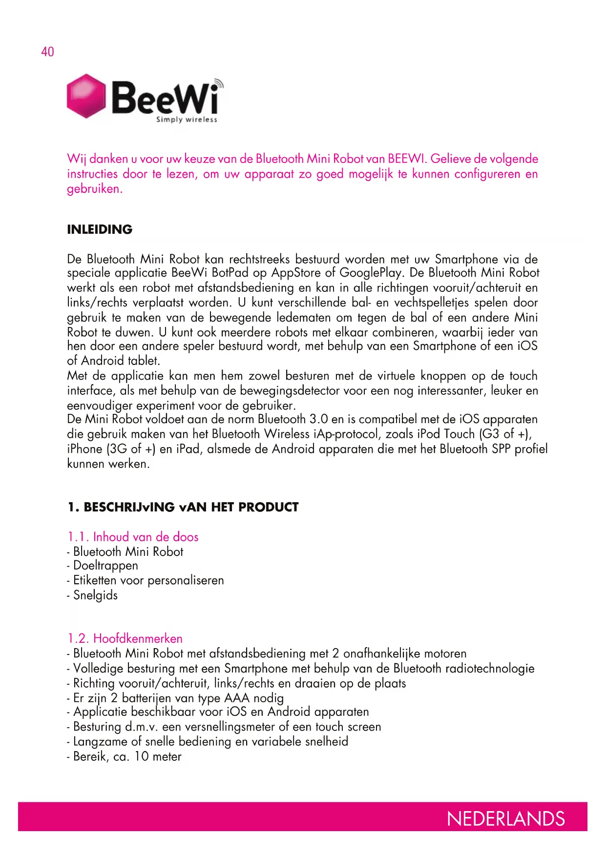 1.1. Inhoud van de doos - Bluetooth Mini Robot - Doeltrappen - Etiketten voor personaliseren - Snelgids 1.2. Hoofdkenmerken - Bluetooth Mini Robot met afstandsbediening met 2 onafhankelijke motoren - Volledige besturing met een Smartphone met behulp van de Bluetooth radiotechnologie - Richting vooruit/achteruit, links/rechts en draaien op de plaats - Er zijn 2 batterijen van type AAA nodig - Applicatie beschikbaar voor iOS en Android apparaten - Besturing d.m.v. een versnellingsmeter of een touch screen - Langzame of snelle bediening en variabele snelheid - Bereik, ca. 10 meter Wij danken u voor uw keuze van de Bluetooth Mini Robot van BEEWI. Gelieve de volgende instructies door te lezen, om uw apparaat zo goed mogelijk te kunnen configureren en gebruiken. NEDERLANDS41 NEDERLANDS 1.3. Afbeelding van het product Aan/Uit-knop Controlelampje Zwenkende ledematen Wieltjes 1.4. Technische gegevens