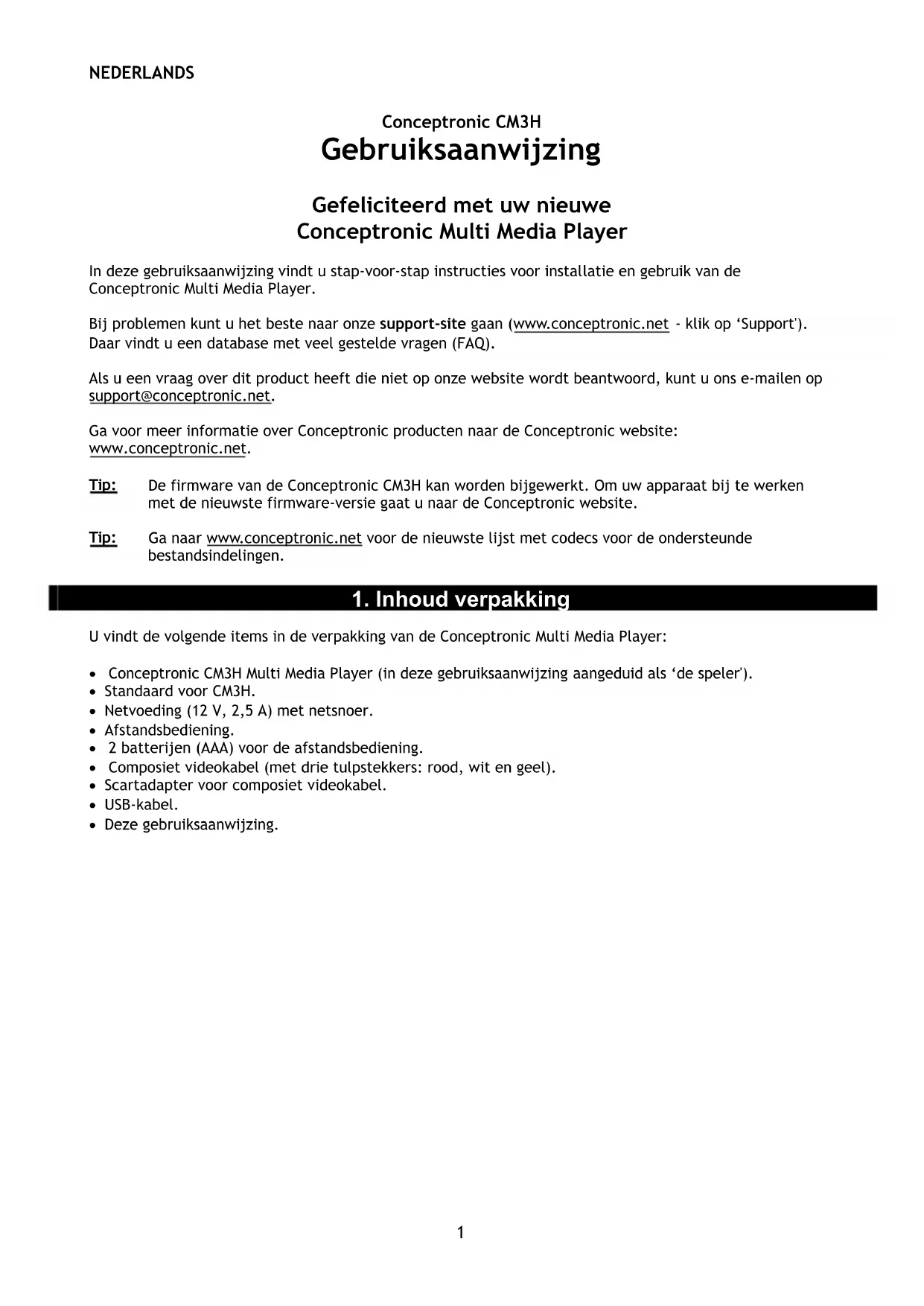 • Conceptronic CM3H Multi Media Player (in deze gebruiksaanwijzing aangeduid als ‘de speler').