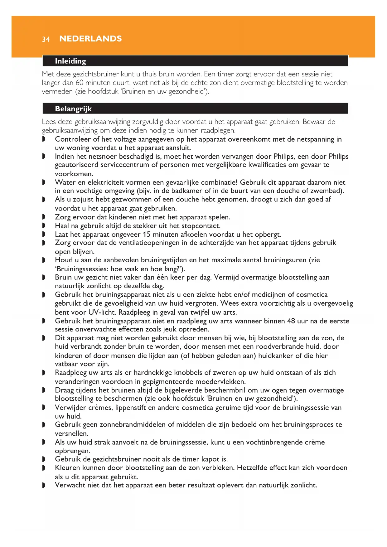 dat u de instructies volgt in hoofdstuk ‘Belangrijk’ en in ‘Bruiningssessies: hoe vaak en hoe lang?’;