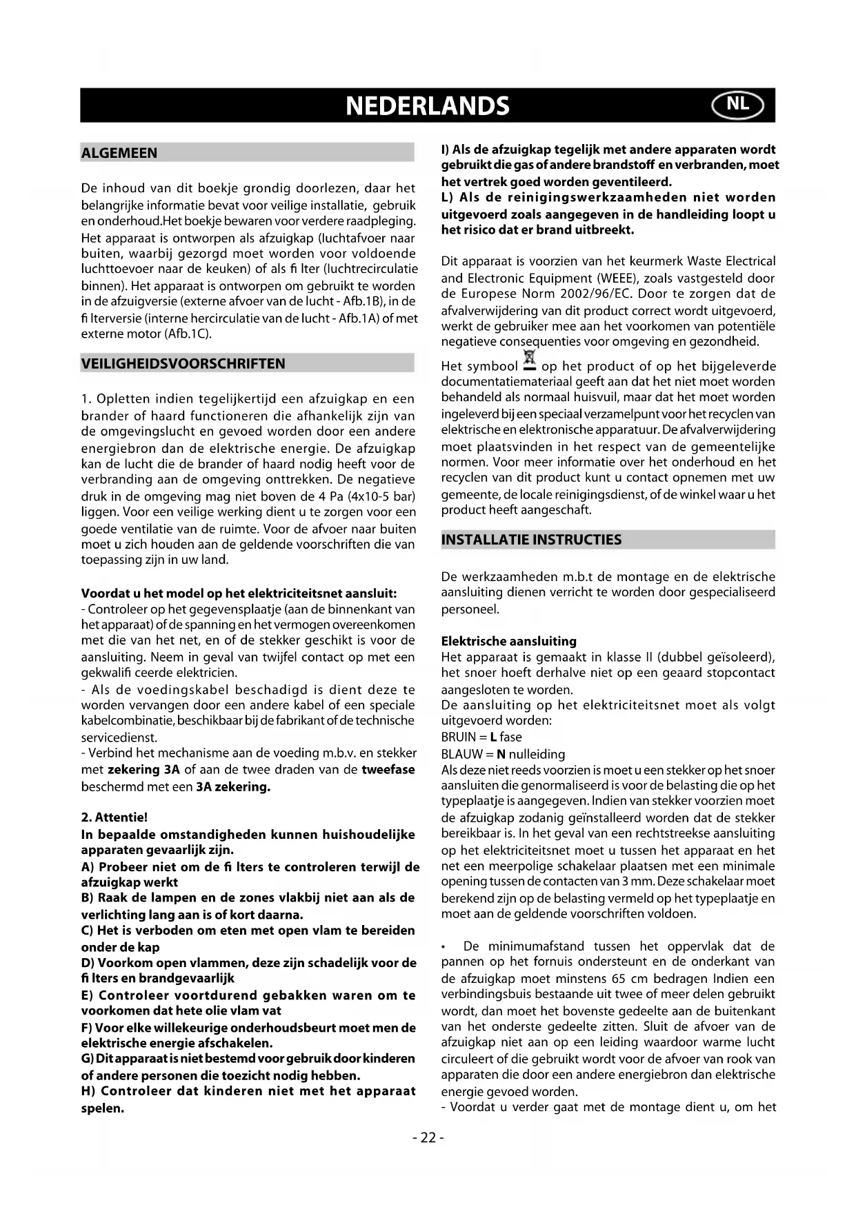 gebruikt die gas of andere brandsto en verbranden, moet het vertrek goed worden geventileerd. L) Als de reinigingswerkzaamheden niet worden uitgevoerd zoals aangegeven in de handleiding loopt u het risico dat er brand uitbreekt. Dit apparaat is voorzien van het keurmerk Waste Electrical and Electronic Equipment (WEEE), zoals vastgesteld door de Europese Norm 2002/96/EC. Door te zorgen dat de afvalverwijdering van dit product correct wordt uitgevoerd, werkt de gebruiker mee aan het voorkomen van potentiële negatieve consequenties voor omgeving en gezondheid. Het symbool op het product of op het bijgeleverde documentatiemateriaal geeft aan dat het niet moet worden behandeld als normaal huisvuil, maar dat het moet worden ingeleverd bij een speciaal verzamelpunt voor het recyclen van elektrische en elektronische apparatuur. De afvalverwijdering moet plaatsvinden in het respect van de gemeentelijke normen. Voor meer informatie over het onderhoud en het recyclen van dit product kunt u contact opnemen met uw gemeente, de locale reinigingsdienst, of de winkel waar u het product heeft aangeschaft. INSTALLATIE INSTRUCTIES De werkzaamheden m.b.t de montage en de elektrische aansluiting dienen verricht te worden door gespecialiseerd personeel. Elektrische aansluiting Het apparaat is gemaakt in klasse II (dubbel geïsoleerd), het snoer hoeft derhalve niet op een geaard stopcontact aangesloten te worden. De aansluiting op het elektriciteitsnet moet als volgt uitgevoerd worden: BRUIN = L fase BLAUW = N nulleiding Als deze niet reeds voorzien is moet u een stekker op het snoer aansluiten die genormaliseerd is voor de belasting die op het typeplaatje is aangegeven. Indien van stekker voorzien moet de afzuigkap zodanig geïnstalleerd worden dat de stekker bereikbaar is. In het geval van een rechtstreekse aansluiting op het elektriciteitsnet moet u tussen het apparaat en het net een meerpolige schakelaar plaatsen met een minimale opening tussen de contacten van 3 mm. Deze schakelaar moet berekend zijn op de belasting vermeld op het typeplaatje en moet aan de geldende voorschriften voldoen.