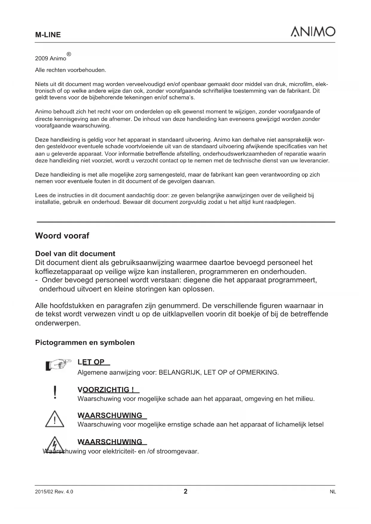 Alle rechten voorbehouden. Niets uit dit document mag worden verveelvoudigd en/of openbaar gemaakt door middel van druk, microfilm, elek- tronisch of op welke andere wijze dan ook, zonder voorafgaande schriftelijke toestemming van de fabrikant. Dit geldt tevens voor de bijbehorende tekeningen en/of schema’s. Animo behoudt zich het recht voor om onderdelen op elk gewenst moment te wijzigen, zonder voorafgaande of directe kennisgeving aan de afnemer. De inhoud van deze handleiding kan eveneens gewijzigd worden zonder voorafgaande waarschuwing. Deze handleiding is geldig voor het apparaat in standaard uitvoering. Animo kan derhalve niet aansprakelijk wor- den gesteldvoor eventuele schade voortvloeiende uit van de standaard uitvoering afwijkende specificaties van het aan u geleverde apparaat. Voor informatie betreffende afstelling, onderhoudswerkzaamheden of reparatie waarin deze handleiding niet voorziet, wordt u verzocht contact op te nemen met de technische dienst van uw leverancier. Deze handleiding is met alle mogelijke zorg samengesteld, maar de fabrikant kan geen verantwoording op zich nemen voor eventuele fouten in dit document of de gevolgen daarvan. Lees de instructies in dit document aandachtig door: ze geven belangrijke aanwijzingen over de veiligheid bij installatie, gebruik en onderhoud. Bewaar dit document zorgvuldig zodat u het altijd kunt raadplegen.