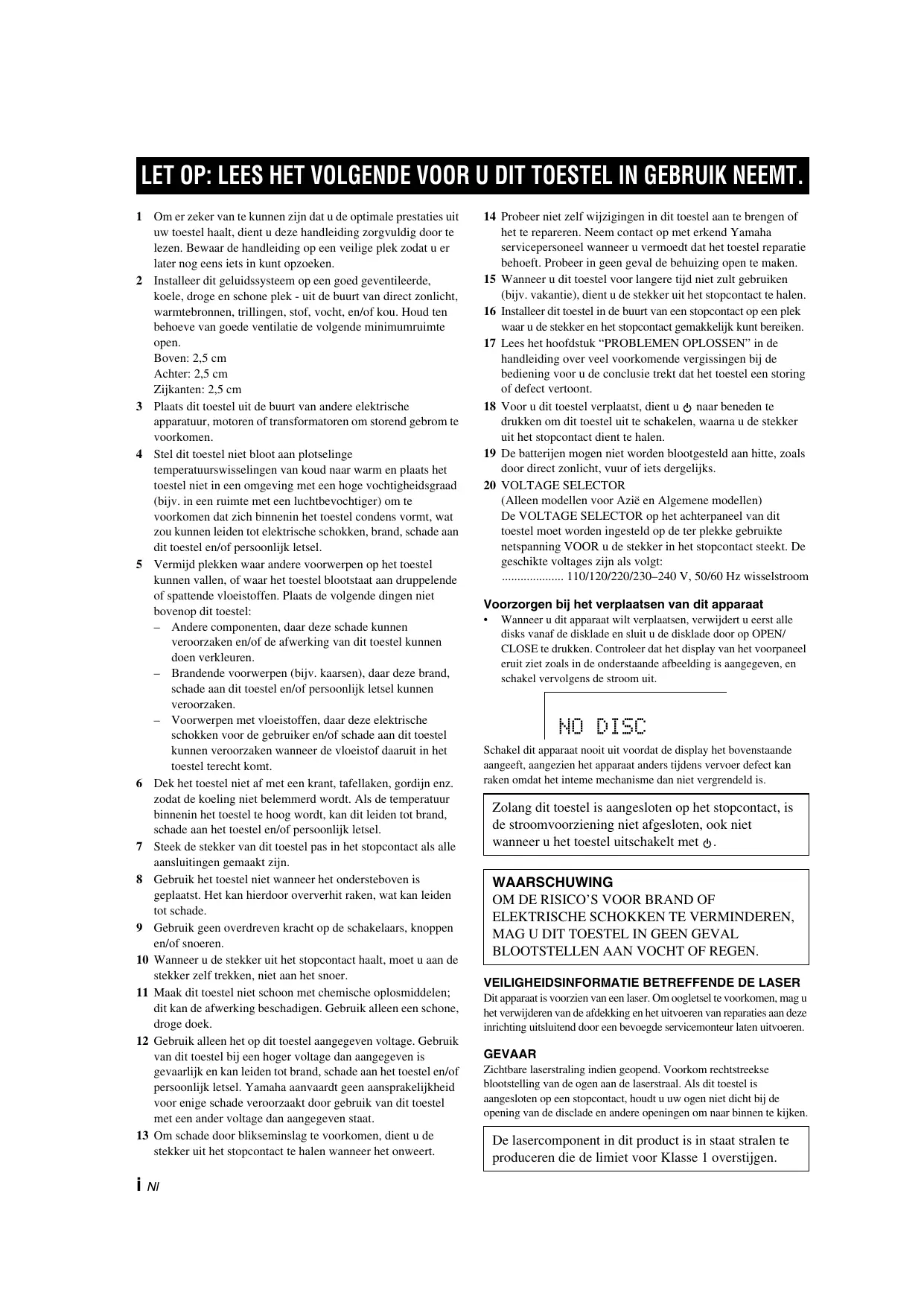 AVERTISSEMENT POUR RÉDUIRE LES RISQUES D’INCENDIE OU DE DÉCHARGE ÉLECTRIQUE, N’EXPOSEZ PAS CET APPAREIL À LA PLUIE OU À L’HUMIDITÉ. SÉCURITÉ LASER L’appareil utilise un laser. En raison des risques de blessure des yeux, le retrait du couvercle ou les réparations de l’appareil devront être confiés exclusivement à un technicien d’entretien qualifié.