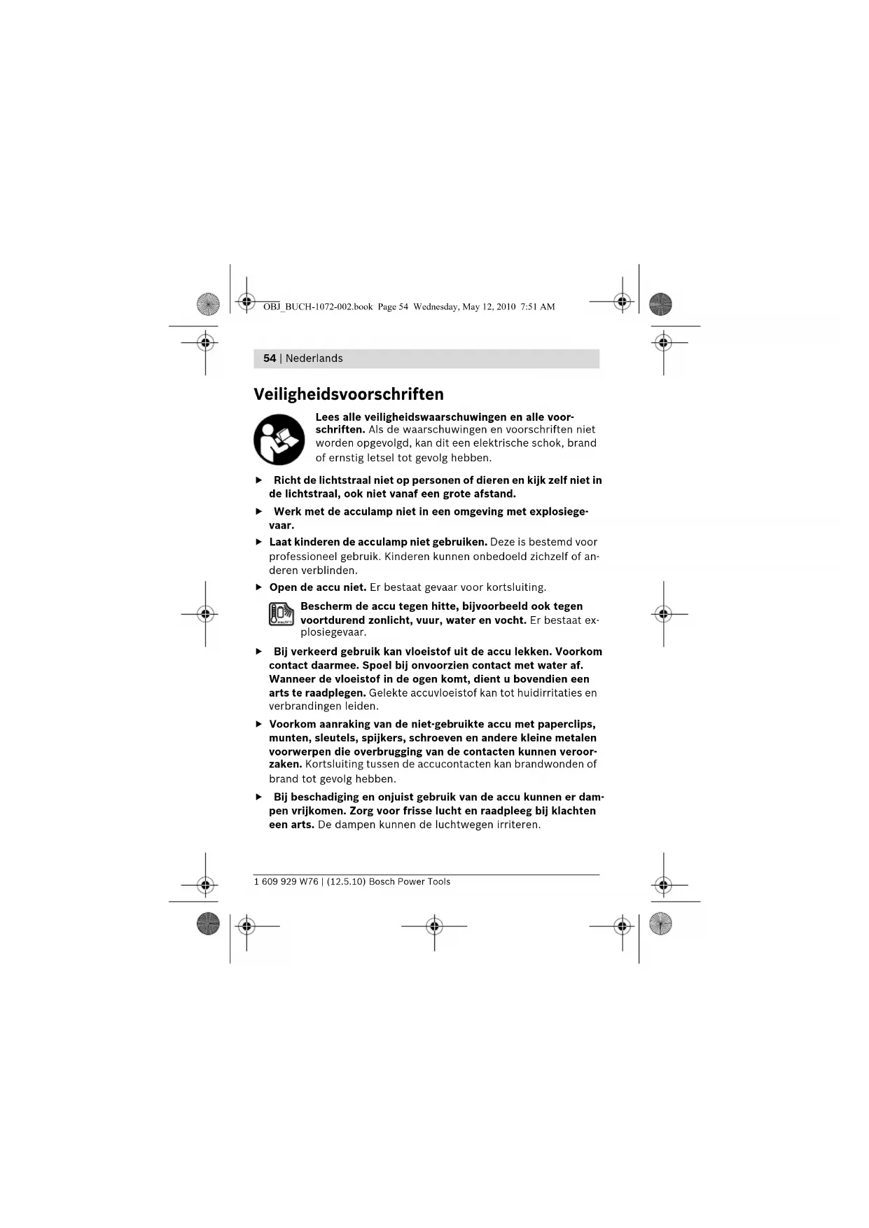 Veiligheidsvoorschriften Lees alle veiligheidswaarschuwingen en alle voor- schriften. Als de waarschuwingen en voorschriften niet worden opgevolgd, kan dit een elektrische schok, brand of ernstig letsel tot gevolg hebben. f Richt de lichtstraal niet op personen of dieren en kijk zelf niet in de lichtstraal, ook niet vanaf een grote afstand. f Werk met de acculamp niet in een omgeving met explosiege- vaar. f Laat kinderen de acculamp niet gebruiken. Deze is bestemd voor professioneel gebruik. Kinderen kunnen onbedoeld zichzelf of an- deren verblinden. f Open de accu niet. Er bestaat gevaar voor kortsluiting. Bescherm de accu tegen hitte, bijvoorbeeld ook tegen voortdurend zonlicht, vuur, water en vocht. Er bestaat ex- plosiegevaar. f Bij verkeerd gebruik kan vloeistof uit de accu lekken. Voorkom contact daarmee. Spoel bij onvoorzien contact met water af. Wanneer de vloeistof in de ogen komt, dient u bovendien een arts te raadplegen. Gelekte accuvloeistof kan tot huidirritaties en verbrandingen leiden. f Voorkom aanraking van de niet-gebruikte accu met paperclips, munten, sleutels, spijkers, schroeven en andere kleine metalen voorwerpen die overbrugging van de contacten kunnen veroor- zaken. Kortsluiting tussen de accucontacten kan brandwonden of brand tot gevolg hebben. f Bij beschadiging en onjuist gebruik van de accu kunnen er dam- pen vrijkomen. Zorg voor frisse lucht en raadpleeg bij klachten een arts. De dampen kunnen de luchtwegen irriteren. OBJ_BUCH-1072-002.book Page 54 Wednesday, May 12, 2010 7:51 AMNederlands | 55 Bosch Power Tools 1 609 929 W76 | (12.5.10) f Laad accu’s alleen op in oplaadapparaten die door de fabrikant worden geadviseerd. Voor een oplaadapparaat dat voor een be- paald type accu geschikt is, bestaat brandgevaar wanneer het met andere accu’s wordt gebruikt. f Gebruik de accu alleen in combinatie met uw Bosch elektrische gereedschap. Alleen zo wordt de accu tegen gevaarlijke overbe- lasting beschermd. f Gebruik alleen originele Bosch-accu’s met de op het typeplaatje van het elektrische gereedschap aangegeven spanning. Bij ge- bruik van andere accu’s, bijvoorbeeld imitaties, opgeknapte ac- cu’s of accu’s van andere merken, bestaat gevaar voor persoonlijk letsel en materiële schade door exploderende accu’s. Functiebeschrijving Gebruik volgens bestemming De acculamp is bestemd voor het met de hand verlichten van een dro- ge ruimte van beperkte omvang. Afgebeelde componenten De componenten zijn genummerd zoals op de afbeelding van de ac- culamp op de pagina met afbeeldingen. 1 Lampkop 2 Aan/uit-schakelaar 3 Accu* 4 Accu-ontgrendelingsknop 5 Riemclip