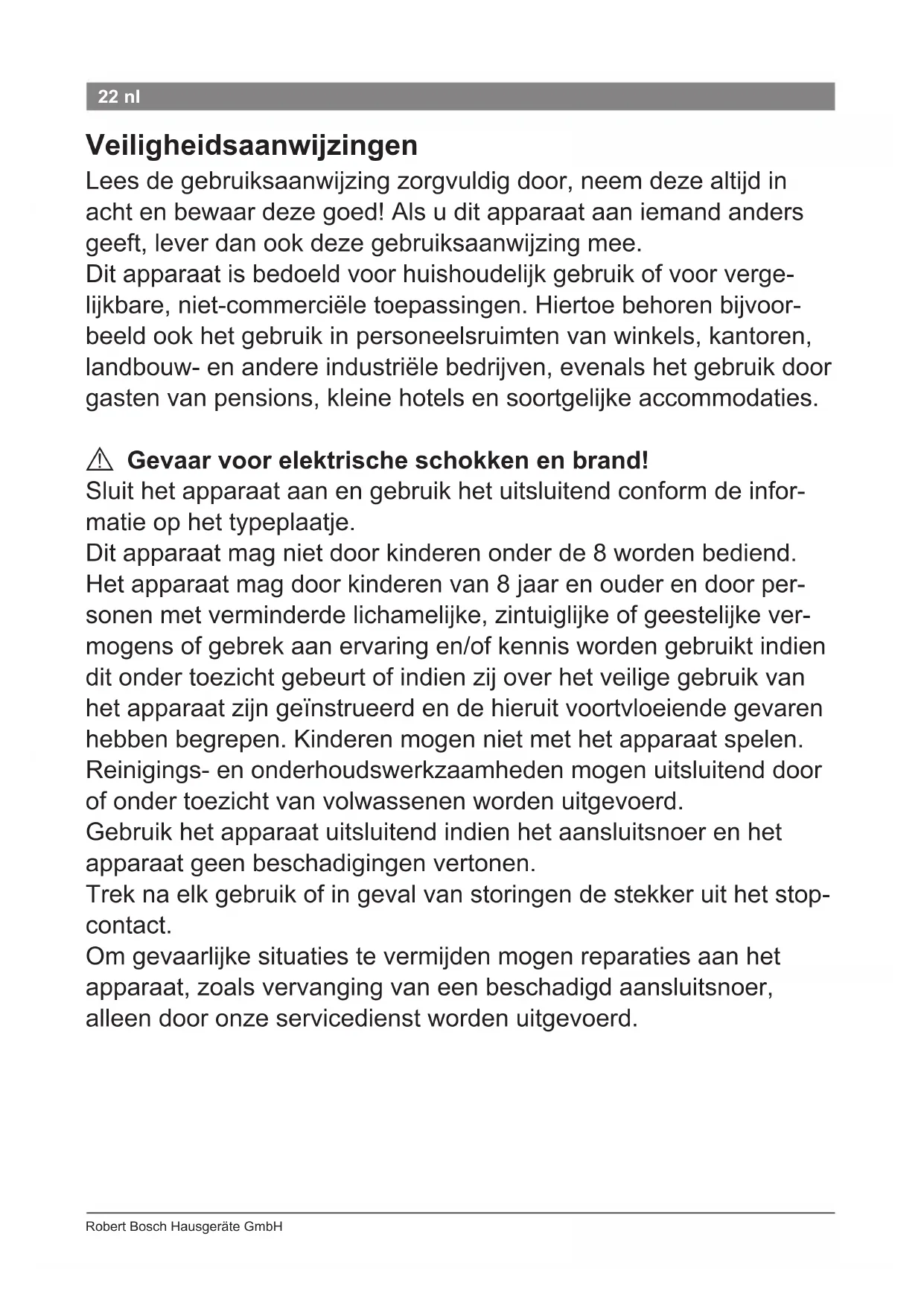 Robert Bosch Hausgeräte GmbH 22 nl Veiligheidsaanwijzingen Lees de gebruiksaanwijzing zorgvuldig door, neem deze altijd in acht en bewaar deze goed! Als u dit apparaat aan iemand anders geeft, lever dan ook deze gebruiksaanwijzing mee. Dit apparaat is bedoeld voor huishoudelijk gebruik of voor verge- lijkbare, niet-commerciële toepassingen. Hiertoe behoren bijvoor- beeld ook het gebruik in personeelsruimten van winkels, kantoren, landbouw- en andere industriële bedrijven, evenals het gebruik door gasten van pensions, kleine hotels en soortgelijke accommodaties.