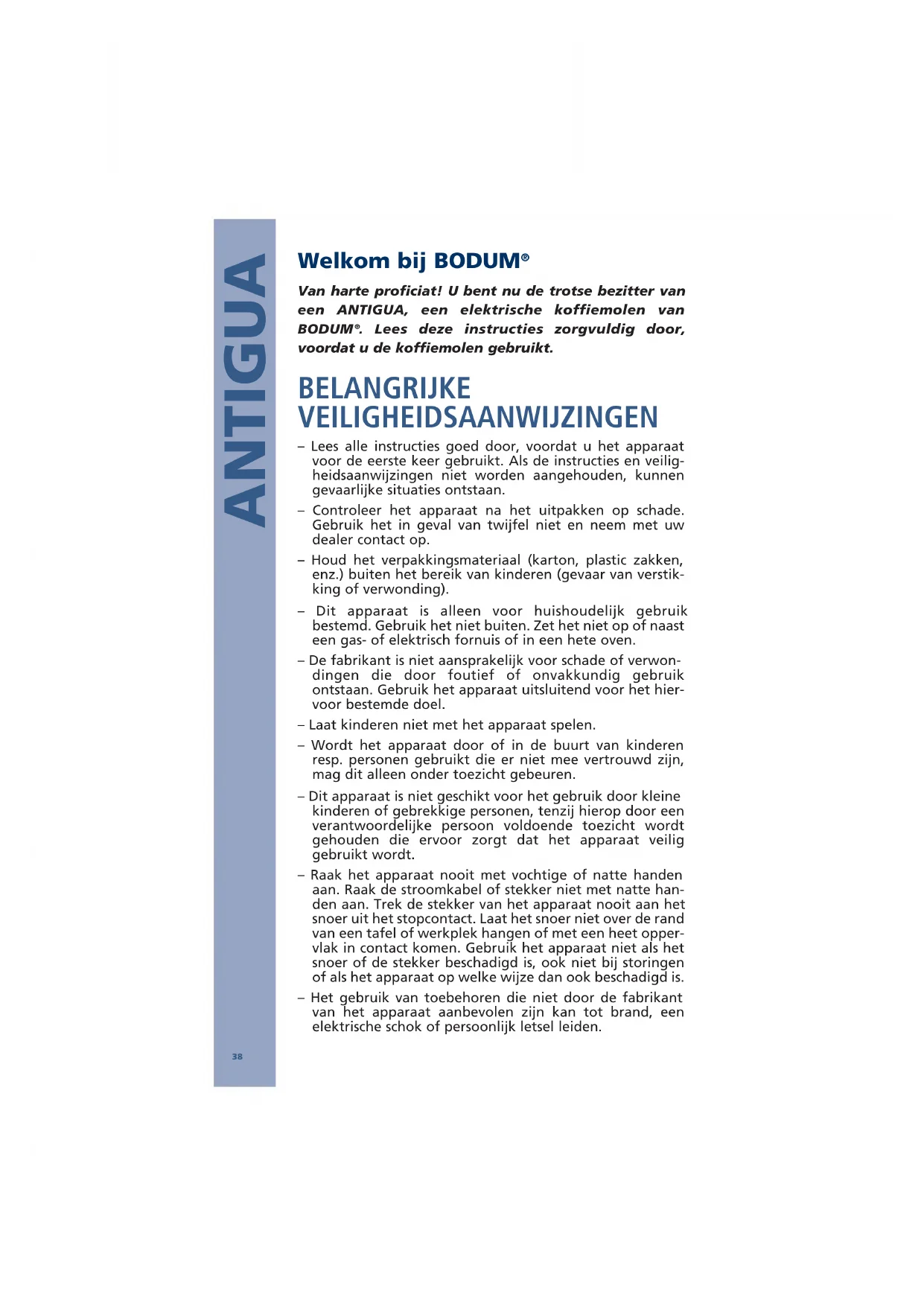 Van harte proficiat! U bent nu de trotse bezitter van een ANTIGUA, een elektrische koffiemolen van BODUM