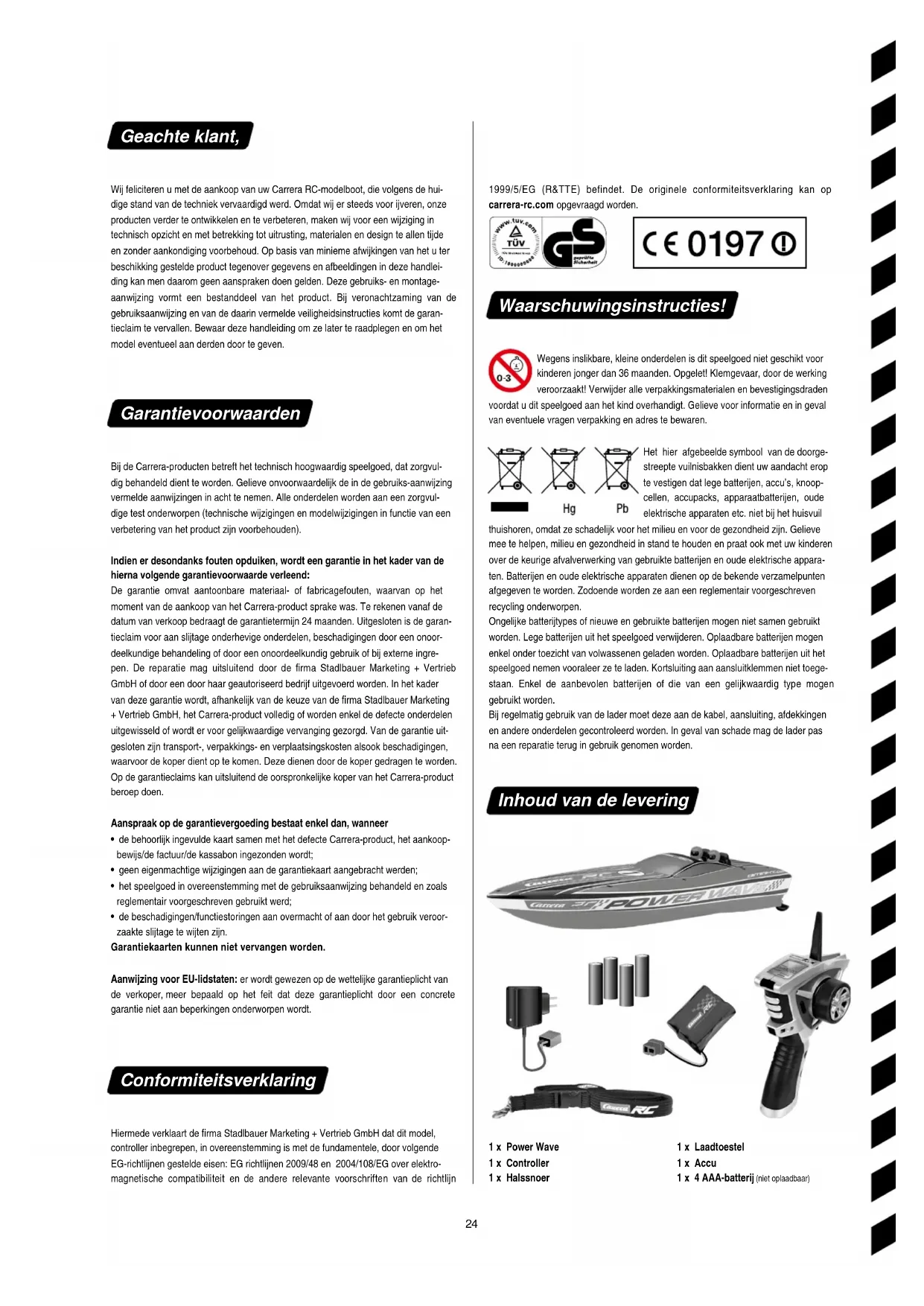 OFF Se occorressero pezzi di ricambio, nell‘area di assistenza di carrerarc.com è disponibile una panoramica completa dei pezzi disponibili. Problema Causa Rimedio Il modellino non funziona L’interruttore sul trasmettitore e/o il modellino è posizionato su »OFF« Accendere Batteria scarica o nessuna batteria nel modellino Inserire una batteria carica La protezione contro il surriscaldamento ha fermato la barca a causa del forte riscaldamento Disinserire il ricevitore. Fare rareddare la barca Carrera RC per ca. 30 minuti Batteria ricaricabile/batterie scariche nel trasmettitore o modellino Inserire una batteria ricaricabile e/o una batteria cariche La barca è molto calda. Lasciare rareddare la barca RC per circa 30 minuti. Nessun controllo La barca si mette in movimento non volutamente. Accendere prima il trasmettitore e poi la barca. Con riserva di errori e modiche Con riserva di modiche dei colori/design denitivo Con riserva di modiche tecniche e dovute al design Pittogrammi = foto simboliche Soluzioni dei problemi Se il controller è acceso, le spie LED rosse nella zona anteriore del controller si illuminano. THTRIMM Regolazione di precisione della velocità Qui è possibile modicare l’eetto frenante della barca. Guida digitale proporzionale Leva dell‘acceleratore indietro: avanti Leva dell‘acceleratore avanti: frenata o indietro SteeringTRIMM Regolazione di precisione dello sterzo Se la barca non procedesse diritto, qui è possibile regolarlo esattamente. Il controller 2,4 GHz è adatto per destri- mani e mancini e può essere adattato alle relative esigenze spostando l‘unità di guida. Controllo del raggio d’azione Se lascia la radiofrequenza, la barca ritorna automaticamente nel raggio d’azione Funzione di commutazione grazie allo spostamento dell’unità di guida Per la trasformazione, svitare le tre viti all’interno dell’unità di guida e applicare quest’ultima sul lato opposto. Togliere la piastra di copertura del lato opposto e montare il volante su questo lato. Riavvitare le tre viti. Finito! Funzioni del controller24 Geachte klant, Wij feliciteren u met de aankoop van uw Carrera RC-modelboot, die volgens de hui- dige stand van de techniek vervaardigd werd. Omdat wij er steeds voor ijveren, onze producten verder te ontwikkelen en te verbeteren, maken wij voor een wijziging in technisch opzicht en met betrekking tot uitrusting, materialen en design te allen tijde en zonder aankondiging voorbehoud. Op basis van minieme afwijkingen van het u ter beschikking gestelde product tegenover gegevens en afbeeldingen in deze handlei- ding kan men daarom geen aanspraken doen gelden. Deze gebruiks- en montage- aanwijzing vormt een bestanddeel van het product. Bij veronachtzaming van de gebruiksaanwijzing en van de daarin vermelde veiligheidsinstructies komt de garan- tieclaim te vervallen. Bewaar deze handleiding om ze later te raadplegen en om het model eventueel aan derden door te geven. Garantievoorwaarden Bij de Carrera-producten betreft het technisch hoogwaardig speelgoed, dat zorgvul- dig behandeld dient te worden. Gelieve onvoorwaardelijk de in de gebruiks-aanwijzing vermelde aanwijzingen in acht te nemen. Alle onderdelen worden aan een zorgvul- dige test onderworpen (technische wijzigingen en modelwijzigingen in functie van een verbetering van het product zijn voorbehouden). Indien er desondanks fouten opduiken, wordt een garantie in het kader van de hierna volgende garantievoorwaarde verleend: De garantie omvat aantoonbare materiaal- of fabricagefouten, waarvan op het moment van de aankoop van het Carrera-product sprake was. Te rekenen vanaf de datum van verkoop bedraagt de garantietermijn 24 maanden. Uitgesloten is de garan- tieclaim voor aan slijtage onderhevige onderdelen, beschadigingen door een onoor- deelkundige behandeling of door een onoordeelkundig gebruik of bij externe ingre- pen. De reparatie mag uitsluitend door de rma Stadlbauer Marketing + Vertrieb GmbH of door een door haar geautoriseerd bedrijf uitgevoerd worden. In het kader van deze garantie wordt, afhankelijk van de keuze van de rma Stadlbauer Marketing + Vertrieb GmbH, het Carrera-product volledig of worden enkel de defecte onderdelen uitgewisseld of wordt er voor gelijkwaardige vervanging gezorgd. Van de garantie uit- gesloten zijn transport-, verpakkings- en verplaatsingskosten alsook beschadigingen, waarvoor de koper dient op te komen. Deze dienen door de koper gedragen te worden. Op de garantieclaims kan uitsluitend de oorspronkelijke koper van het Carrera-product beroep doen. Aanspraak op de garantievergoeding bestaat enkel dan, wanneer