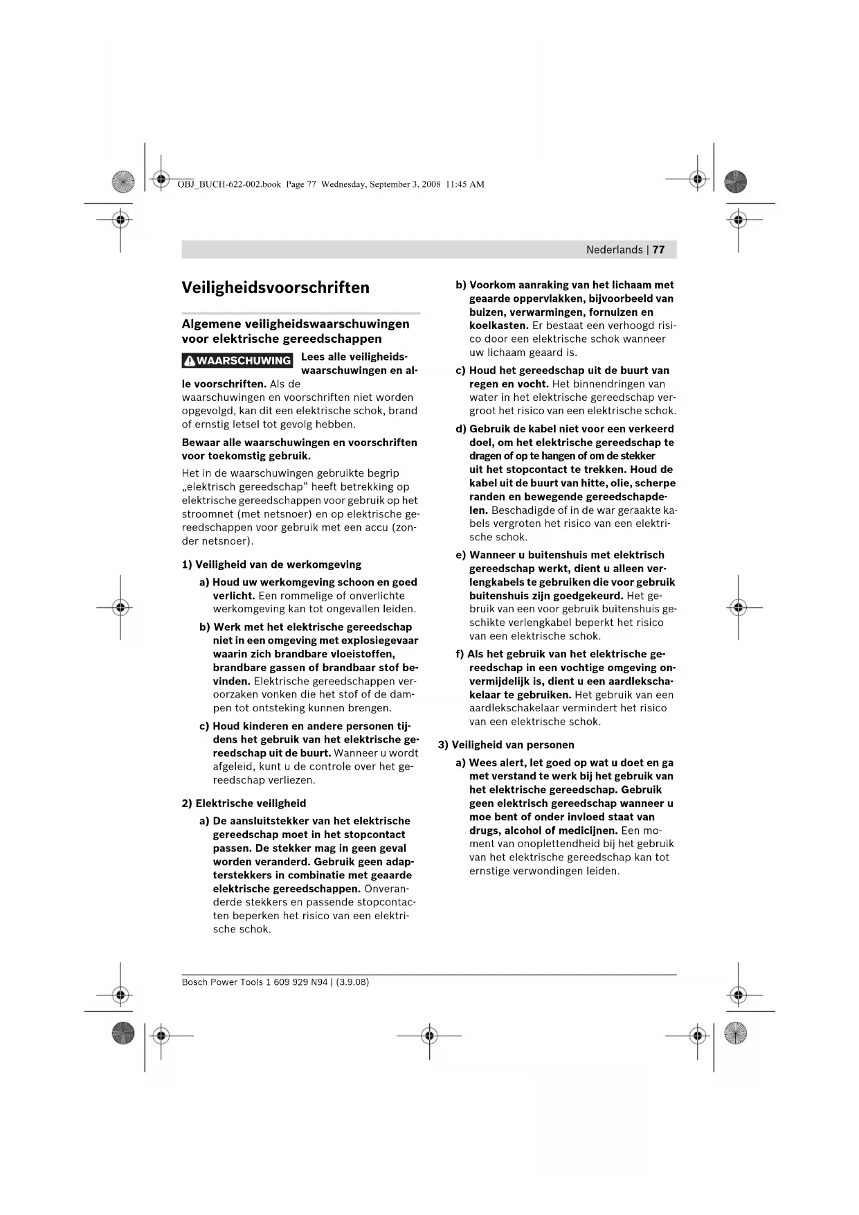 bruik van elektrische gereedschappen a) Overbelast het gereedschap niet. Ge- bruik voor uw werkzaamheden het daar- voor bestemde elektrische gereedschap. Met het passende elektrische gereed- schap werkt u beter en veiliger binnen het aangegeven capaciteitsbereik. b) Gebruik geen elektrisch gereedschap waarvan de schakelaar defect is. Elek- trisch gereedschap dat niet meer kan wor- den in- of uitgeschakeld, is gevaarlijk en moet worden gerepareerd. c) Trek de stekker uit het stopcontact of neem de accu uit het elektrische gereed- schap voordat u het gereedschap instelt, toebehoren wisselt of het gereedschap weglegt. Deze voorzorgsmaatregel voor- komt onbedoeld starten van het elektri- sche gereedschap. d) Bewaar niet-gebruikte elektrische ge- reedschappen buiten bereik van kinde- ren. Laat het gereedschap niet gebrui- ken door personen die er niet mee vertrouwd zijn en deze aanwijzingen niet hebben gelezen. Elektrische gereed- schappen zijn gevaarlijk wanneer deze door onervaren personen worden ge- bruikt. e) Verzorg het elektrische gereedschap zorgvuldig. Controleer of bewegende de- len van het gereedschap correct functio- neren en niet vastklemmen en of onder- delen zodanig gebroken of beschadigd zijn dat de werking van het elektrische gereedschap nadelig wordt beïnvloed. Laat deze beschadigde onderdelen voor het gebruik repareren. Veel ongevallen hebben hun oorzaak in slecht onderhou- den elektrische gereedschappen. f) Houd snijdende inzetgereedschappen scherp en schoon. Zorgvuldig onderhou- den snijdende inzetgereedschappen met scherpe snijkanten klemmen minder snel vast en zijn gemakkelijker te geleiden. OBJ_BUCH-622-002.book Page 78 Wednesday, September 3, 2008 11:45 AMNederlands | 79 Bosch Power Tools 1 609 929 N94 | (3.9.08) g) Gebruik elektrisch gereedschap, toebe- horen, inzetgereedschappen en dergelij- ke volgens deze aanwijzingen. Let daar- bij op de arbeidsomstandigheden en de uit te voeren werkzaamheden. Het ge- bruik van elektrische gereedschappen voor andere dan de voorziene toepassin- gen kan tot gevaarlijke situaties leiden.