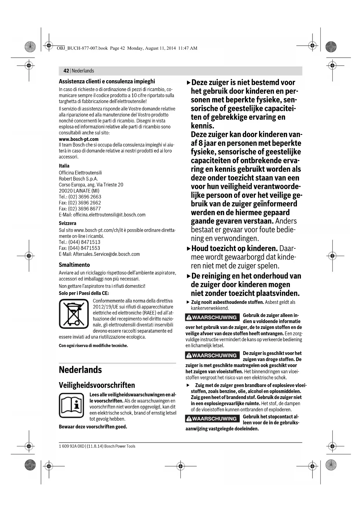 OBJ_BUCH-877-007.book Page 41 Monday, August 11, 2014 11:47 AM42 | Nederlands 1 609 92A 0XD | (11.8.14) Bosch Power Tools Assistenza clienti e consulenza impieghi In caso di richieste o di ordinazione di pezzi di ricambio, co-municare sempre il codice prodotto a 10 cifre riportato sulla targhetta di fabbricazione dell’elettroutensile!Il servizio di assistenza risponde alle Vostre domande relative alla riparazione ed alla manutenzione del Vostro prodotto nonché concernenti le parti di ricambio. Disegni in vista esplosa ed informazioni relative alle parti di ricambio sono consultabili anche sul sito:www.bosch-pt.comIl team Bosch che si occupa della consulenza impieghi vi aiu-terà in caso di domande relative ai nostri prodotti ed ai loro accessori.ItaliaOfficina ElettroutensiliRobert Bosch S.p.A.Corso Europa, ang. Via Trieste 2020020 LAINATE (MI)Tel.: (02) 3696 2663Fax: (02) 3696 2662Fax: (02) 3696 8677E-Mail: officina.elettroutensili@it.bosch.comSvizzeraSul sito www.bosch-pt.com/ch/it è possible ordinare diretta-mente on-line i ricambi.Tel.: (044) 8471513Fax: (044) 8471553E-Mail: Aftersales.Service@de.bosch.com Smaltimento Avviare ad un riciclaggio rispettoso dell’ambiente aspiratore, accessori ed imballaggi non più necessari.Non gettare l’aspiratore tra i rifiuti domestici!Solo per i Paesi della CE:Conformemente alla norma della direttiva 2012/19/UE sui rifiuti di apparecchiature elettriche ed elettroniche (RAEE) ed all’at-tuazione del recepimento nel diritto nazio-nale, gli elettroutensili diventati inservibili devono essere raccolti separatamente ed essere inviati ad una riutilizzazione ecologica.Con ogni riserva di modifiche tecniche. Nederlands