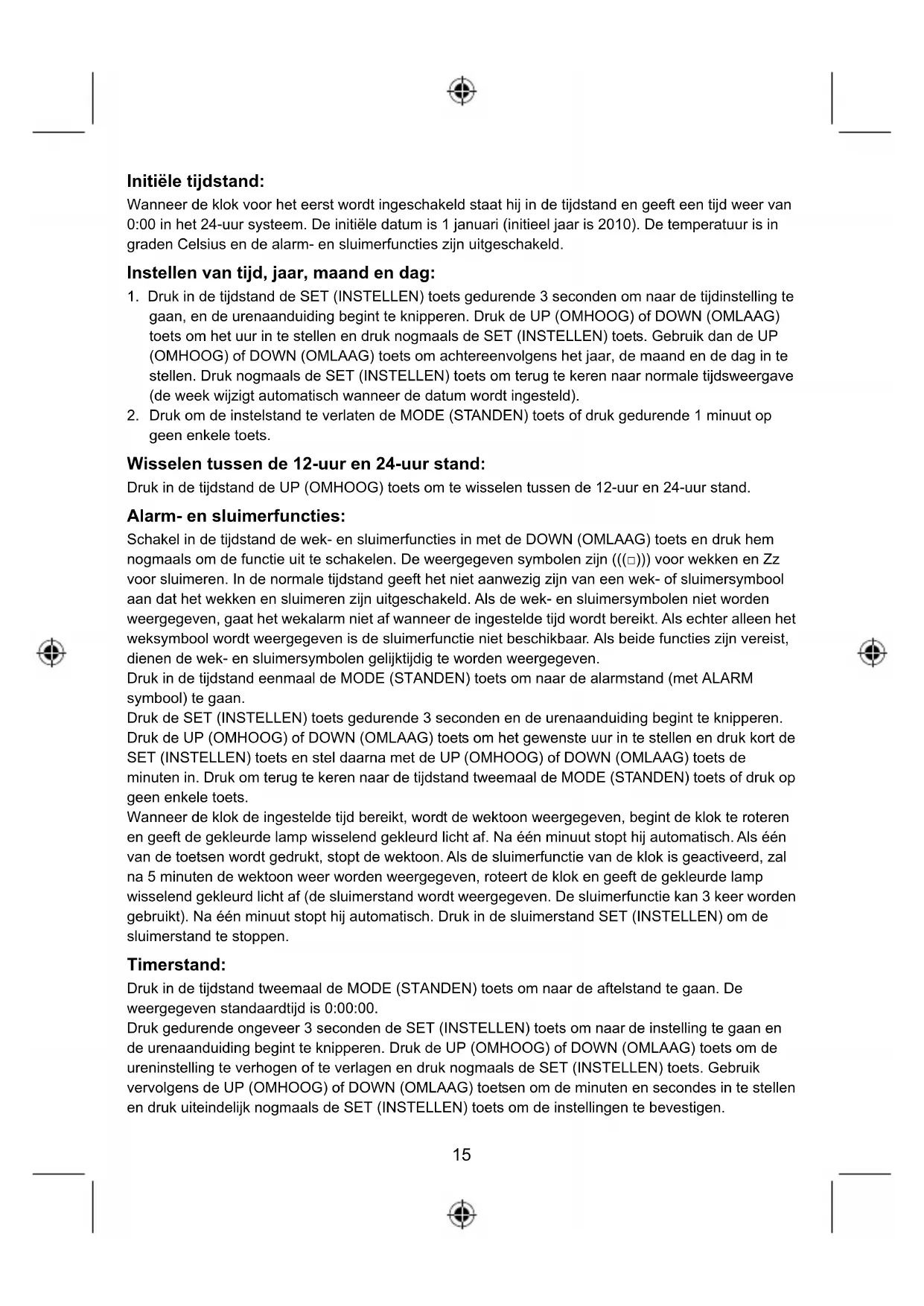 - Aftelfunctie15 Initiële tijdstand: Wanneer de klok voor het eerst wordt ingeschakeld staat hij in de tijdstand en geeft een tijd weer van 0:00 in het 24-uur systeem. De initiële datum is 1 januari (initieel jaar is 2010). De temperatuur is in graden Celsius en de alarm- en sluimerfuncties zijn uitgeschakeld. Instellen van tijd, jaar, maand en dag: