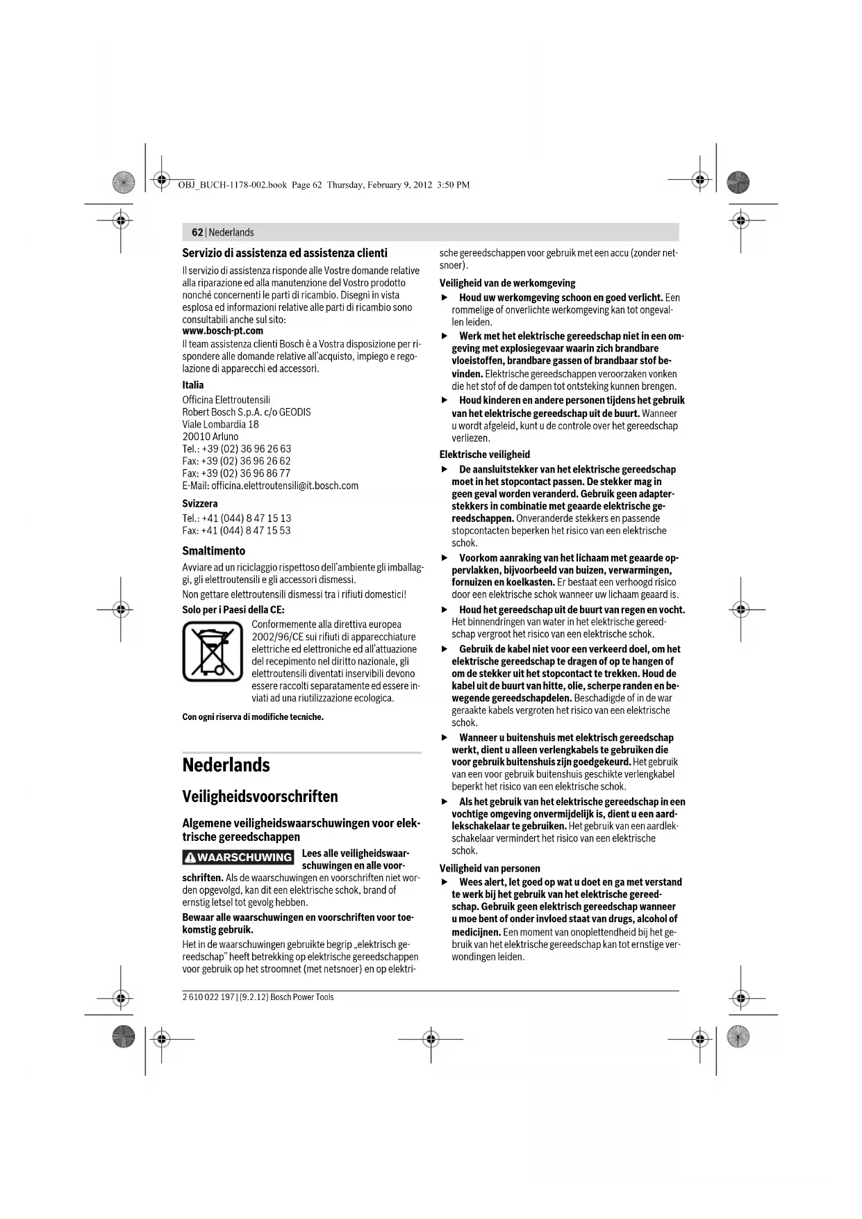 zioni differenti, come illustrato nella figura. – Per la lavorazione di superfici piane lisce rimuovere la cuf- fia di aspirazione. Manutenzione ed assistenza Manutenzione e pulizia f Prima di qualunque intervento sull’elettroutensile estrarre la spina di rete dalla presa. f Per poter garantire buone e sicure operazioni di lavoro, tenere sempre puliti l’elettroutensile e le prese di ven- tilazione. f In caso di condizioni di impiego estreme utilizzare sem- pre un impianto di aspirazione. Soffiare spesso sulle fe- ritoie di ventilazione e preinstallare un interruttore di sicurezza per correnti di guasto (FI). In caso di lavorazio- ne di metalli è possibile che si depositi polvere conduttrice all’interno dell’elettroutensile. L’isolamento di protezione dell’elettroutensile può esserne pregiudicato. Qualora si rendesse necessaria una sostituzione del cavo di collegamento, la stessa deve essere effettuata dalla Bosch oppure da un centro di assistenza clienti autorizzato per elet- troutensili Bosch per evitare pericoli per la sicurezza. Se nonostante gli accurati procedimenti di produzione e di controllo l’elettroutensile dovesse guastarsi, la riparazione va fatta effettuare da un punto di assistenza autorizzato per gli elettroutensili Bosch. In caso di richieste o di ordinazione di pezzi di ricambio, co- municare sempre il codice prodotto a 10 cifre riportato sulla targhetta di fabbricazione dell’elettroutensile! OBJ_BUCH-1178-002.book Page 61 Thursday, February 9, 2012 3:50 PM62 | Nederlands 2 610 022 197 | (9.2.12) Bosch Power Tools Servizio di assistenza ed assistenza clienti Il servizio di assistenza risponde alle Vostre domande relative alla riparazione ed alla manutenzione del Vostro prodotto nonché concernenti le parti di ricambio. Disegni in vista esplosa ed informazioni relative alle parti di ricambio sono consultabili anche sul sito: www.bosch-pt.com Il team assistenza clienti Bosch è a Vostra disposizione per ri- spondere alle domande relative all’acquisto, impiego e rego- lazione di apparecchi ed accessori. Italia Officina Elettroutensili Robert Bosch S.p.A. c/o GEODIS Viale Lombardia 18 20010 Arluno Tel.: +39 (02) 36 96 26 63 Fax: +39 (02) 36 96 26 62 Fax: +39 (02) 36 96 86 77 E-Mail: officina.elettroutensili@it.bosch.com Svizzera Tel.: +41 (044) 8 47 15 13 Fax: +41 (044) 8 47 15 53 Smaltimento Avviare ad un riciclaggio rispettoso dell’ambiente gli imballag- gi, gli elettroutensili e gli accessori dismessi. Non gettare elettroutensili dismessi tra i rifiuti domestici! Solo per i Paesi della CE: Conformemente alla direttiva europea 2002/96/CE sui rifiuti di apparecchiature elettriche ed elettroniche ed all’attuazione del recepimento nel diritto nazionale, gli elettroutensili diventati inservibili devono essere raccolti separatamente ed essere in- viati ad una riutilizzazione ecologica. Con ogni riserva di modifiche tecniche. Nederlands Veiligheidsvoorschriften Algemene veiligheidswaarschuwingen voor elek- trische gereedschappen Lees alle veiligheidswaar- schuwingen en alle voor- schriften. Als de waarschuwingen en voorschriften niet wor- den opgevolgd, kan dit een elektrische schok, brand of ernstig letsel tot gevolg hebben. Bewaar alle waarschuwingen en voorschriften voor toe- komstig gebruik. Het in de waarschuwingen gebruikte begrip „elektrisch ge- reedschap” heeft betrekking op elektrische gereedschappen voor gebruik op het stroomnet (met netsnoer) en op elektri- sche gereedschappen voor gebruik met een accu (zonder net- snoer). Veiligheid van de werkomgeving f Houd uw werkomgeving schoon en goed verlicht. Een rommelige of onverlichte werkomgeving kan tot ongeval- len leiden. f Werk met het elektrische gereedschap niet in een om- geving met explosiegevaar waarin zich brandbare vloeistoffen, brandbare gassen of brandbaar stof be- vinden. Elektrische gereedschappen veroorzaken vonken die het stof of de dampen tot ontsteking kunnen brengen. f Houd kinderen en andere personen tijdens het gebruik van het elektrische gereedschap uit de buurt. Wanneer u wordt afgeleid, kunt u de controle over het gereedschap verliezen. Elektrische veiligheid f De aansluitstekker van het elektrische gereedschap moet in het stopcontact passen. De stekker mag in geen geval worden veranderd. Gebruik geen adapter- stekkers in combinatie met geaarde elektrische ge- reedschappen. Onveranderde stekkers en passende stopcontacten beperken het risico van een elektrische schok. f Voorkom aanraking van het lichaam met geaarde op- pervlakken, bijvoorbeeld van buizen, verwarmingen, fornuizen en koelkasten. Er bestaat een verhoogd risico door een elektrische schok wanneer uw lichaam geaard is. f Houd het gereedschap uit de buurt van regen en vocht. Het binnendringen van water in het elektrische gereed- schap vergroot het risico van een elektrische schok. f Gebruik de kabel niet voor een verkeerd doel, om het elektrische gereedschap te dragen of op te hangen of om de stekker uit het stopcontact te trekken. Houd de kabel uit de buurt van hitte, olie, scherpe randen en be- wegende gereedschapdelen. Beschadigde of in de war geraakte kabels vergroten het risico van een elektrische schok. f Wanneer u buitenshuis met elektrisch gereedschap werkt, dient u alleen verlengkabels te gebruiken die voor gebruik buitenshuis zijn goedgekeurd. Het gebruik van een voor gebruik buitenshuis geschikte verlengkabel beperkt het risico van een elektrische schok. f Als het gebruik van het elektrische gereedschap in een vochtige omgeving onvermijdelijk is, dient u een aard- lekschakelaar te gebruiken. Het gebruik van een aardlek- schakelaar vermindert het risico van een elektrische schok. Veiligheid van personen f Wees alert, let goed op wat u doet en ga met verstand te werk bij het gebruik van het elektrische gereed- schap. Gebruik geen elektrisch gereedschap wanneer u moe bent of onder invloed staat van drugs, alcohol of medicijnen. Een moment van onoplettendheid bij het ge- bruik van het elektrische gereed