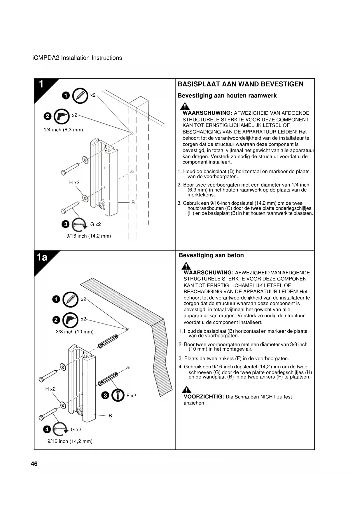 LETSEL OF BESCHADIGING VAN DE APPARATUUR LEIDEN! Het behoort tot de verantwoordelijkheid van de installateur te zorgen dat het gewicht van alle componenten die aan de iCMPDA2 zijn bevestigd, in totaal niet hoger is dan 75 lbs (34 kg).