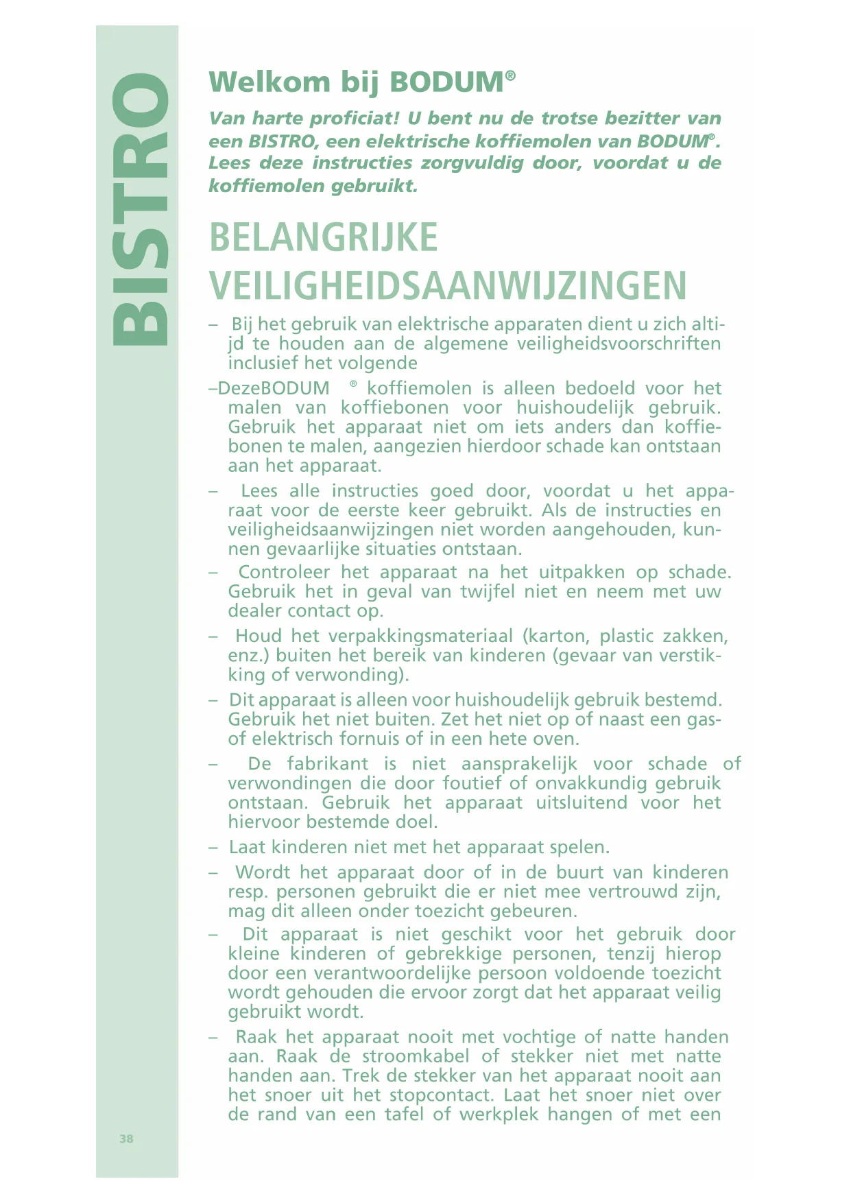 Van harte proficiat! U bent nu de trotse bezitter van een BISTRO, een elektrische koffiemolen van BODUM. Lees deze instructies zorgvuldig door, voordat u de koffiemolen gekruikt.