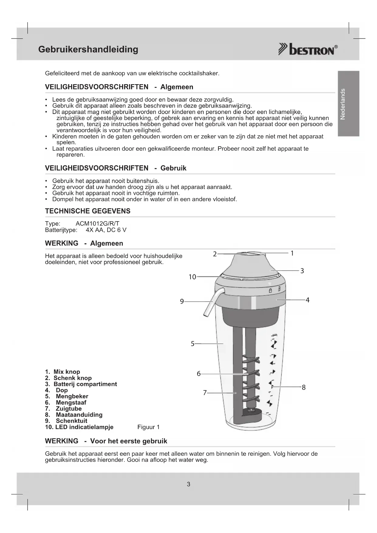 Nederlands Gefeliciteerd met de aankoop van uw elektrische cocktailshaker. VEILIGHEIDSVOORSCHRIFTEN - Algemeen