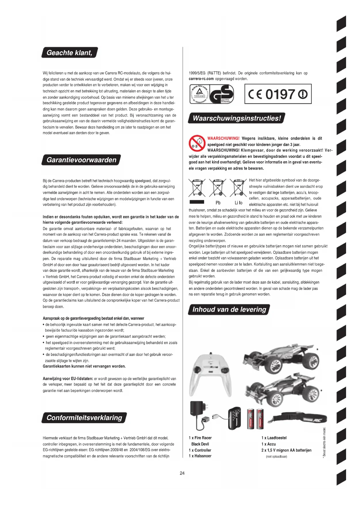 - de beschadigingen/functiestoringen aan overmacht of aan door het gebruik veroor- zaakte slijtage te wijten zijn. Garantiekaarten kunnen niet vervangen worden. Aanwijzi ng voor EU-lidstaten: er wordt gewezen op de wettelijke garantieplicht van de verkoper, meer bepaald op het feit dat deze garantieplicht door een concrete garantie niet aan beperkingen onderworpen wordt. Conformiteitsverklaring Hiermede verklaart de firma Stadlbauer Marketing + Vertrieb GmbH dat dit model, controller inbegrepen, in overeenstemming is met de fundamentele, door volgende EG-richtlijnen gestelde eisen: EG richtlijnen 2009/48 en 2004/108/EG over elektro- magnetische compatibiliteit en de andere relevante voorschriften van de richtlijn 1999/5/EG (R&TTE) befindet. De originele conformiteitsverklaring kan op carrera-rc.com opgevraagd worden. Waarschuwingsinstructies! WAARSCHUWING! We gens inslikbare, kleine onderdelen is dit speelgoed niet geschikt voor kinderen jonger dan 3 jaar. WAARSCHUWING! Klemgevaar, door de werking veroorzaakt! Ver- wijder alle ve rpakkingsmaterialen en bevestigingsdraden voordat u di t speel- goed aan het kind overhandigt. Gelieve vo or informatie en in geval van eventu- ele vragen verpakking en adres te bewaren. Het hier afgebeelde symbool van de doorge- streepte vuilnisbakken dient uw aandacht erop te vestigen dat lege batterijen, accu’s, knoop- cellen, accupacks, apparaatbatterijen, oude elektrische apparaten etc. niet bij het huisvuil thuishoren, omdat ze schadelijk voor het milieu en voor de gezondheid zijn. Gelieve mee te helpen, milieu en gezondheid in stand te houden en praat ook met uw kinderen over de keurige afvalverwerking van gebruikte batterijen en oude elektrische appara- ten. Batterijen en oude elektrische apparaten dienen op de bekende verzamelpunten afgegeven te worden. Zodoende worden ze aan een reglementair voorgeschreven recycling onderworpen. Ongelijke batterijtypes of nieuwe en gebruikte batterijen mogen niet samen gebruikt worden. Lege batterijen uit het speelgoed verwijderen. Oplaadbare batterijen mogen enkel onder toezicht van volwassenen geladen worden. Oplaadbare batterijen uit het speelgoed nemen vooraleer ze te laden. Kortsluiting aan aansluitklemmen niet toege- staan. Enkel de aanbevolen batterijen of die van een gelijkwaardig type mogen gebruikt worden. Bij regelmatig gebruik van de lader moet deze aan de kabel, aansluiting, afdekkingen en andere onderdelen gecontroleerd worden. In geval van schade mag de lader pas na een reparatie terug in gebruik genomen worden. Inhoud van de levering 1 x Laadtoestel 1 x Accu 2 x 1,5 V mignon AA batterijen